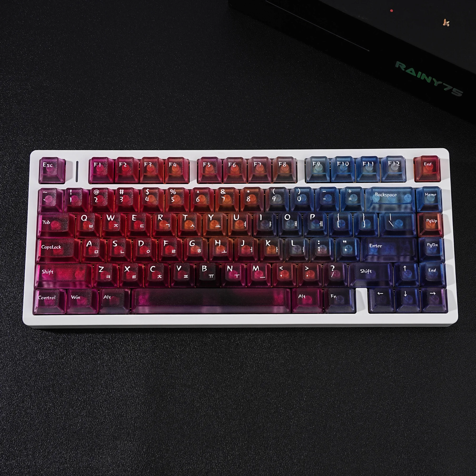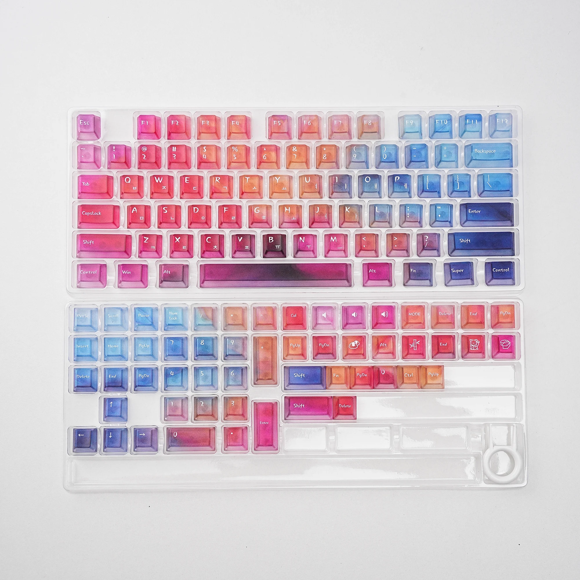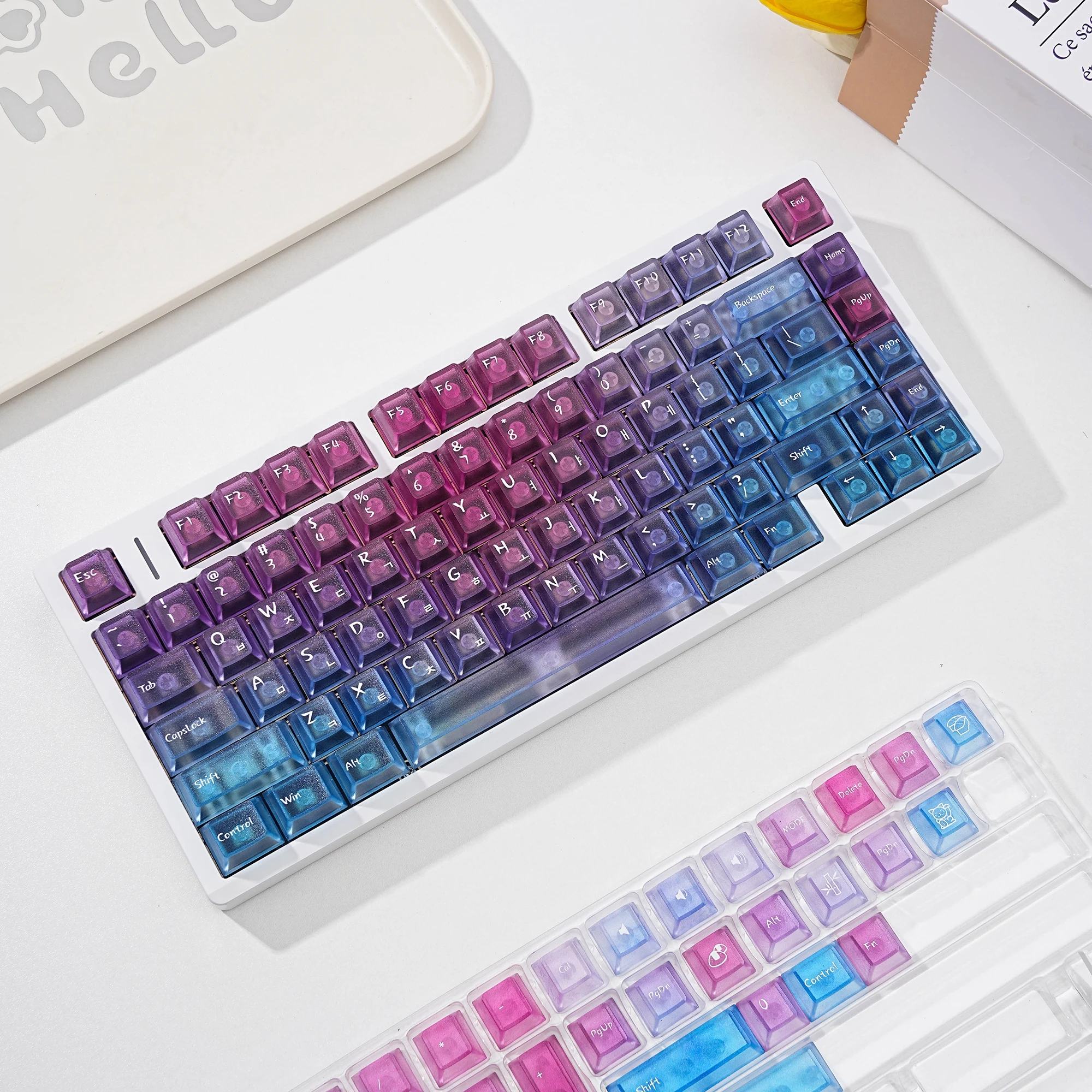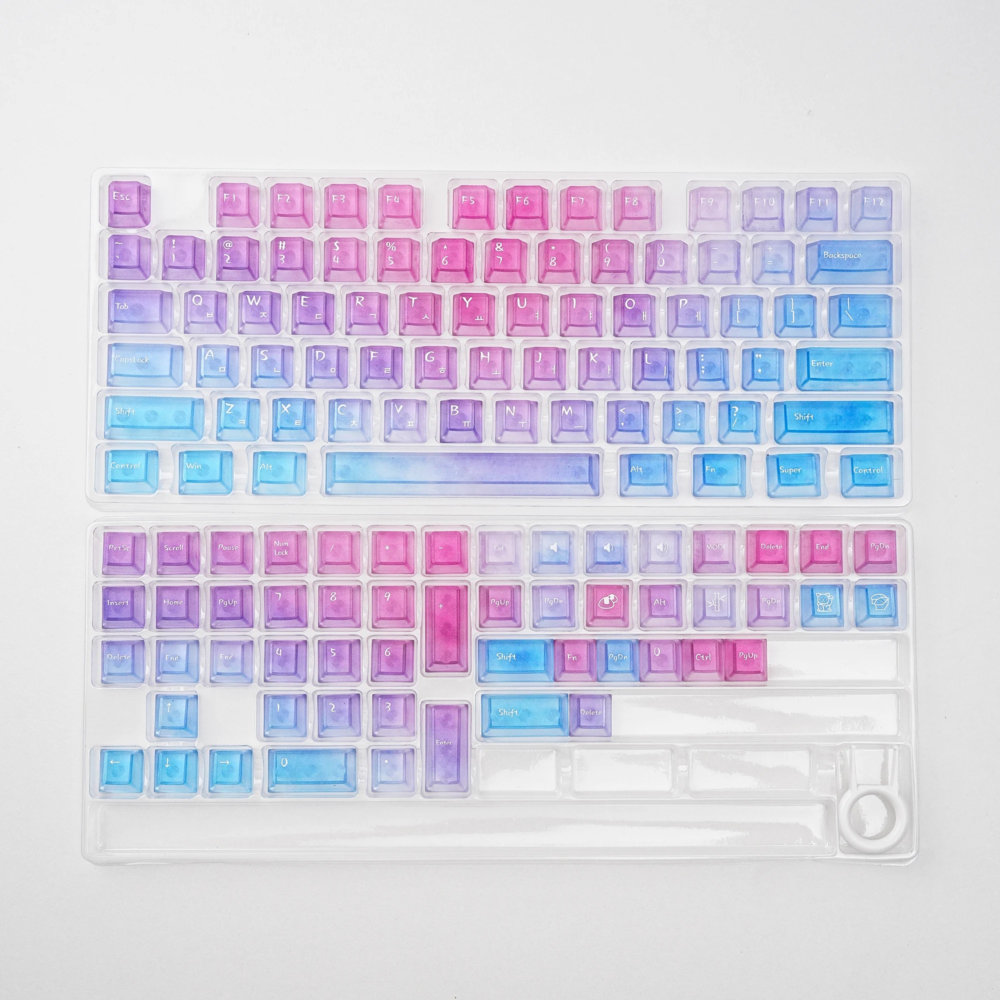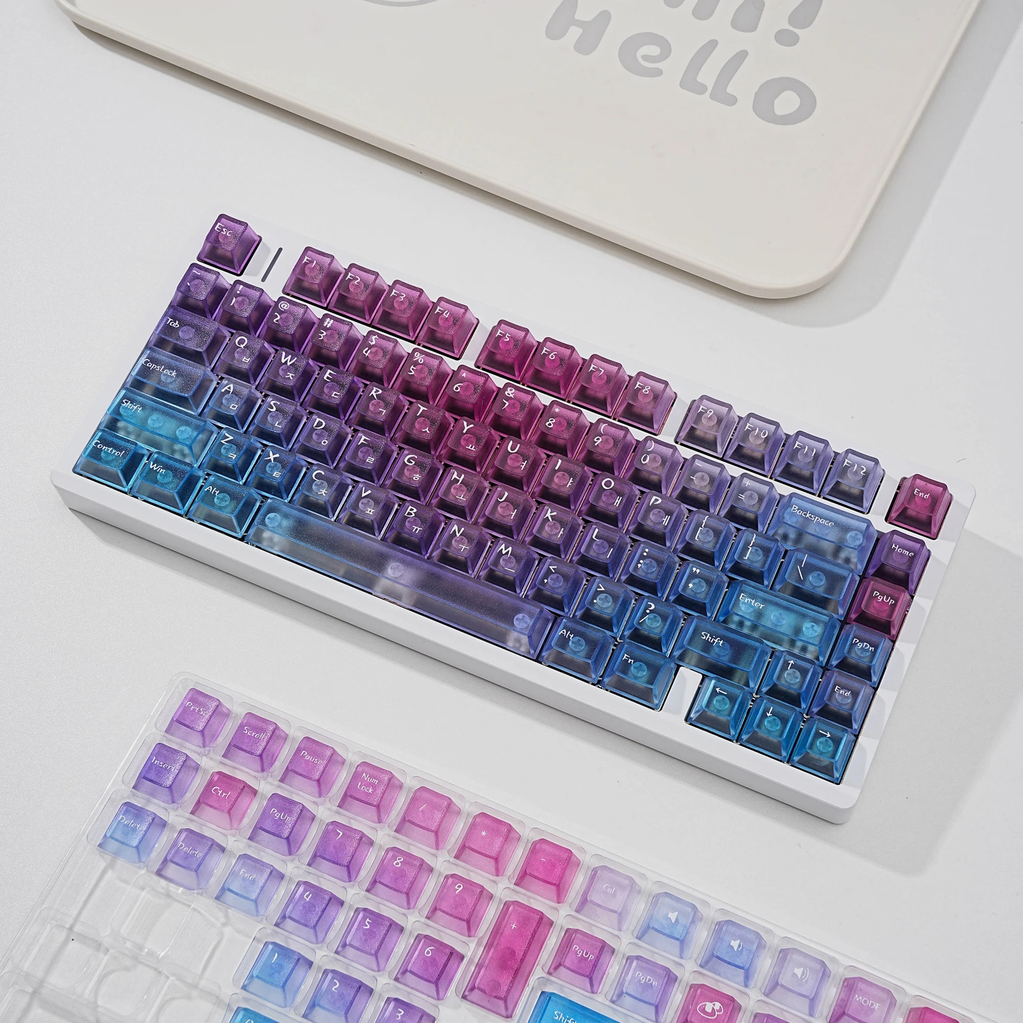 Viene bien empaquetado en plástico de burbujas. Se ve bonito. Intenté instalarlo en un teclado transparente. La textura se siente ligeramente áspera. ¿Debería decir que tiene un poco de sensación de rasguño? No es resbaladizo y las teclas encajan perfectamente. Tiene grabado en coreano. La entrega fue más rápida de lo esperado. Si estás buscando teclas antideslizantes, recomiendo estas teclas.