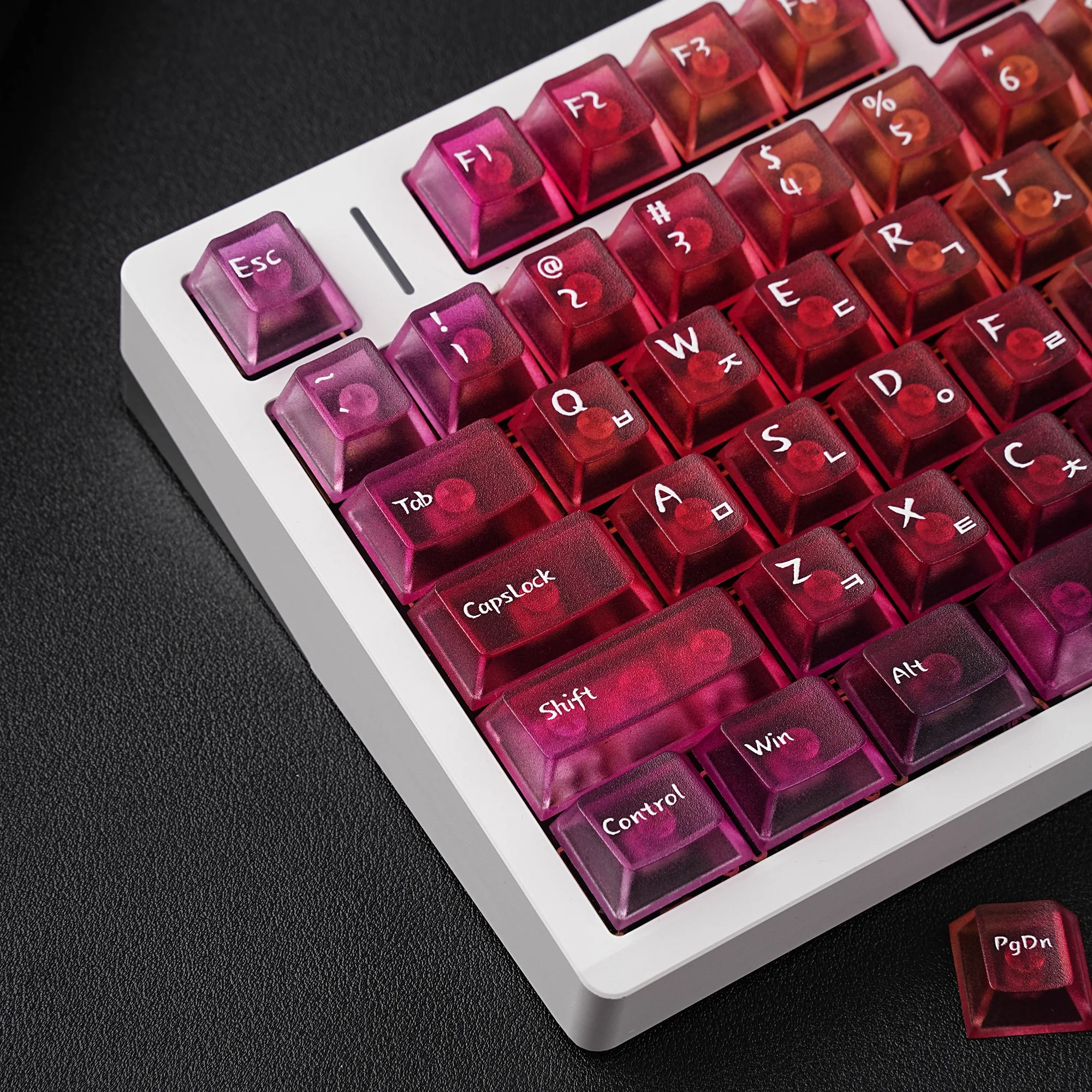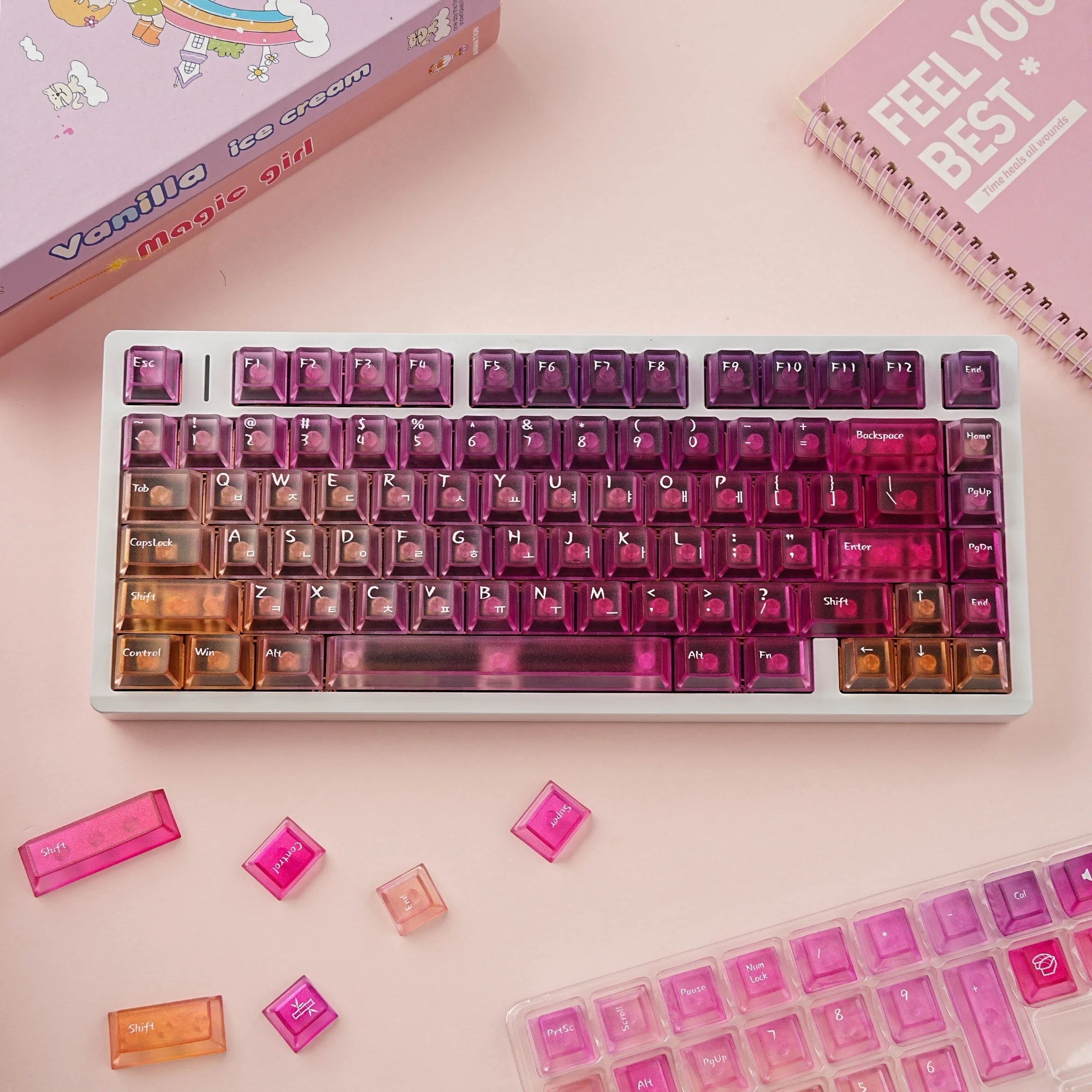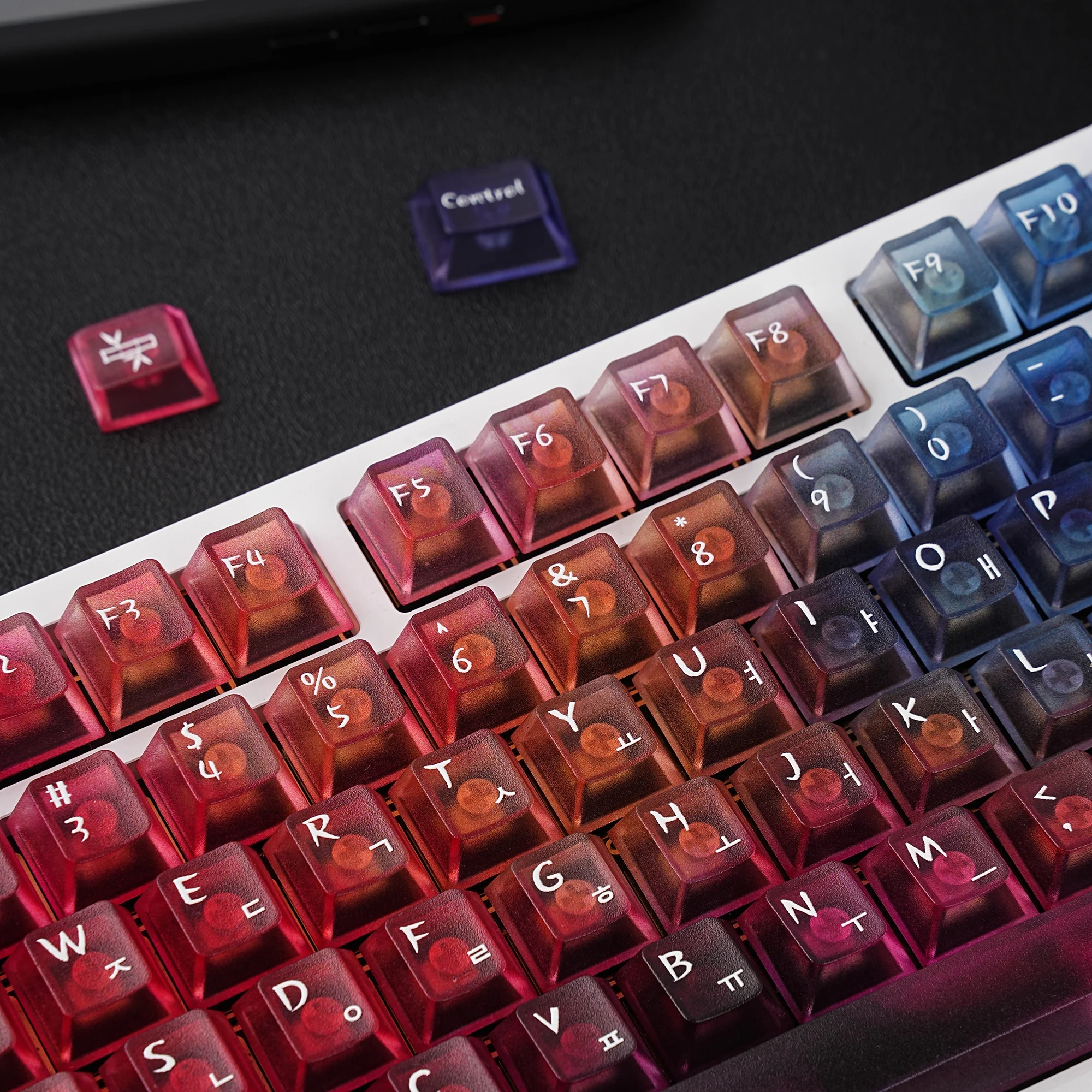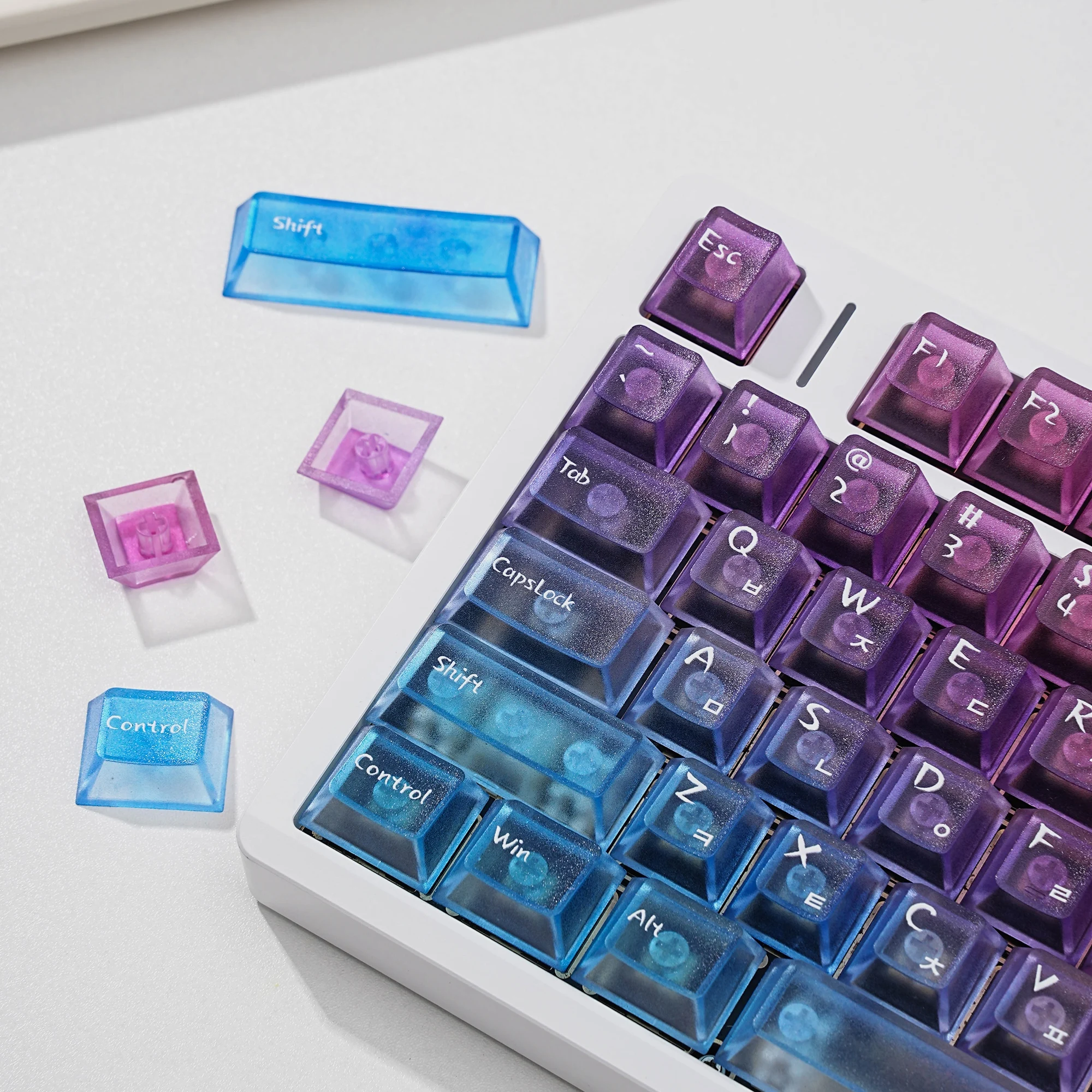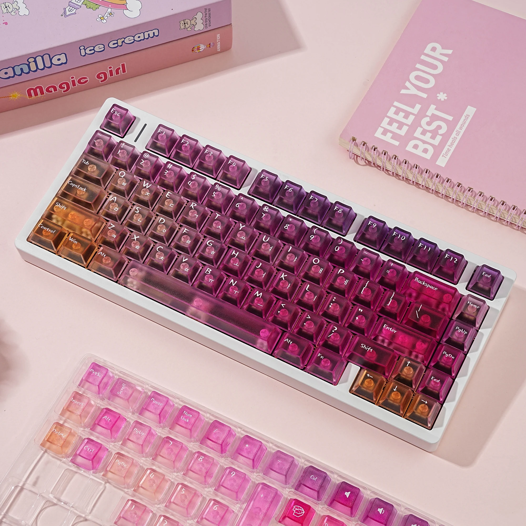 Viene bien empaquetado en plástico de burbujas. Se ve bonito. Intenté instalarlo en un teclado transparente. La textura se siente ligeramente áspera. ¿Debería decir que tiene un poco de sensación de rasguño? No es resbaladizo y las teclas encajan perfectamente. Tiene grabado en coreano. La entrega fue más rápida de lo esperado. Si estás buscando teclas antideslizantes, recomiendo estas teclas.