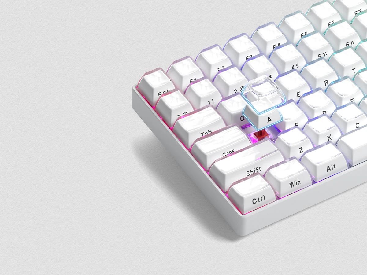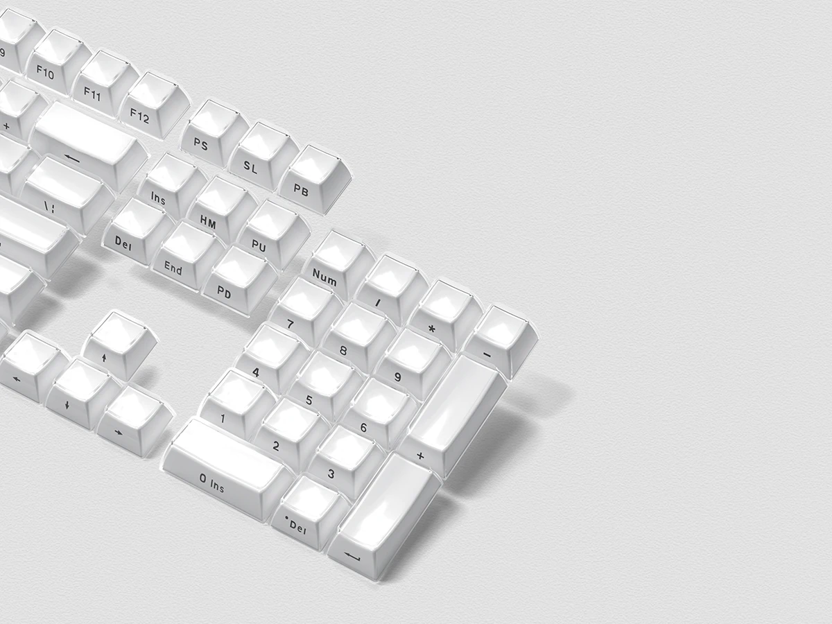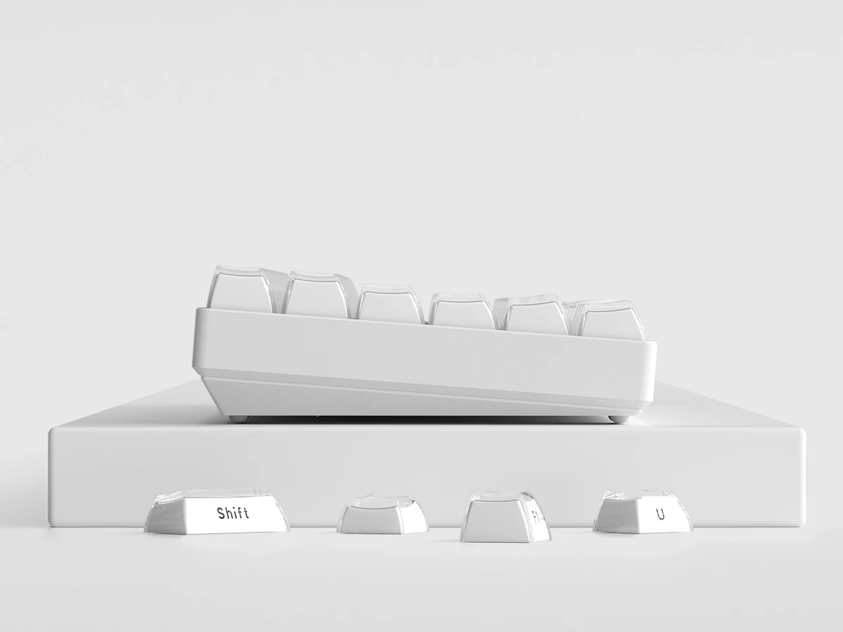 《Teclas rosas de material de PC》Debido a las propiedades del material, las teclas transparentes pueden ser vulnerables a los rayones y dejar el sudor/aceite de las manos que el material PBT.
