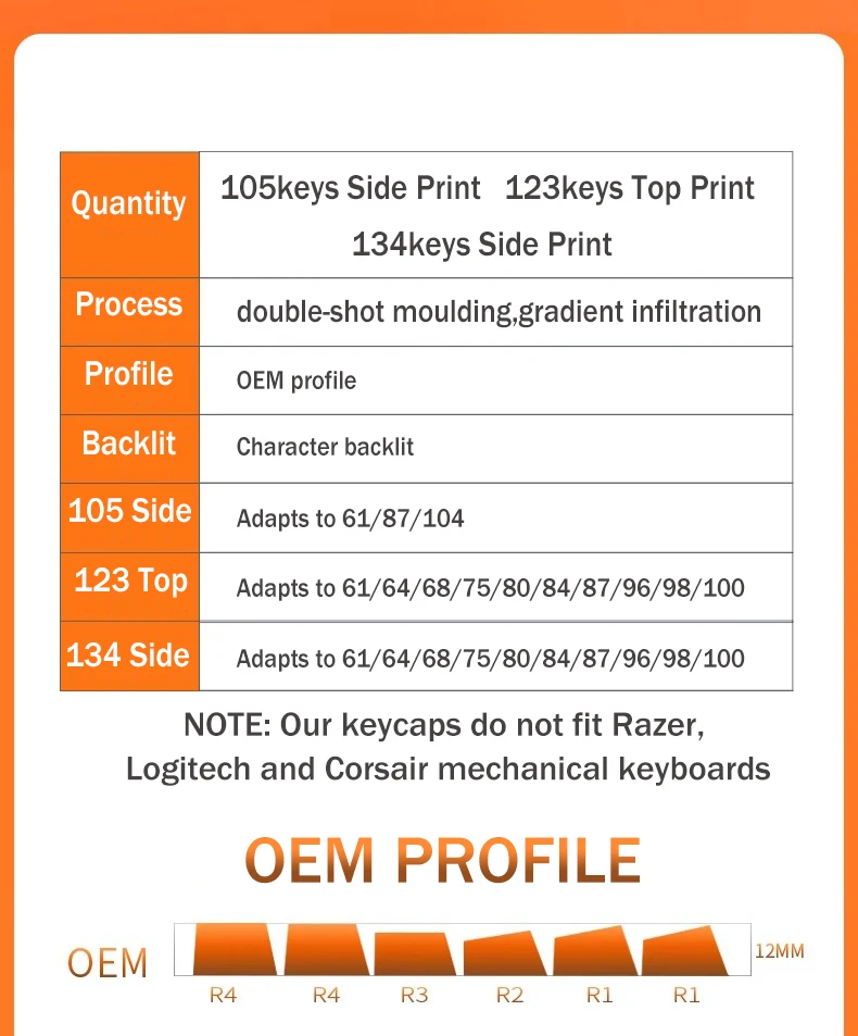 La versión de impresión lateral de 134 teclas incluye cambio 1.75U 2U, 1.5U Alt Ctrl, 6.25U 7U Barra espaciadora, es compatible con 61 、 64 、 68 、 71 、 75 、 84 、 87 、 96 、 980 、 teclado mecánico de diseño 104 、 108, etc. con interruptores MX