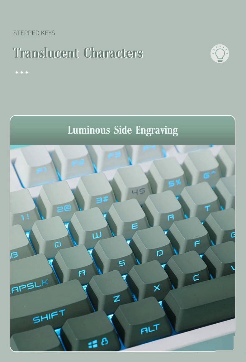 105 keys Side Print version includes 6.25U spacebar,it is compatible with 61、87、104、etc. layout mechanical keyboard with MX switches