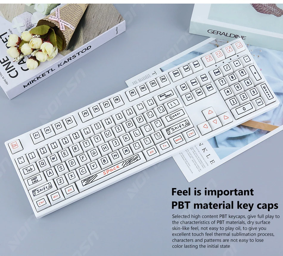 Teclas PBT con sublimación de tinta: con material PBT de alta calidad y un revestimiento antigrasa, estas teclas proporcionan una durabilidad de primera categoría y una gran sensación al escribir. Menos propenso a la acumulación de suciedad. La tecnología de sublimación de tinta hace que el color haya penetrado en la tecla, la vida útil de hasta diez años no se desvanecerá.