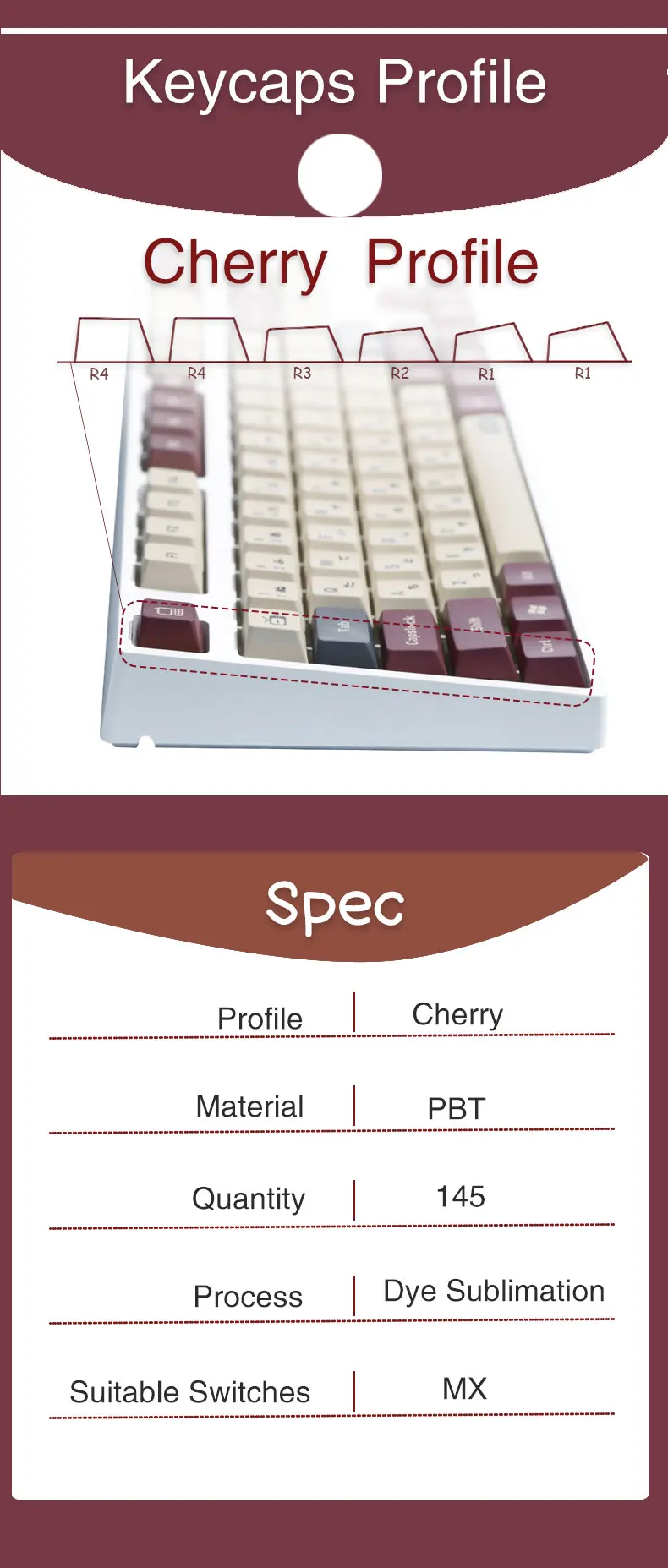 Número de teclas: 145 teclas, incluye 1.25U 1.75U 2U cambio, 5U alt ctrl, 6.25U 7U Barra espaciadora