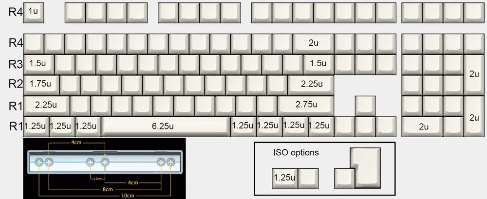 It can be used for most ANSI ISO Cherry MX switches and clones Mechanical Keyboard 104 87 61 whose bottom is 1x6.25u + 7x1.25u.The space is 11.7cm