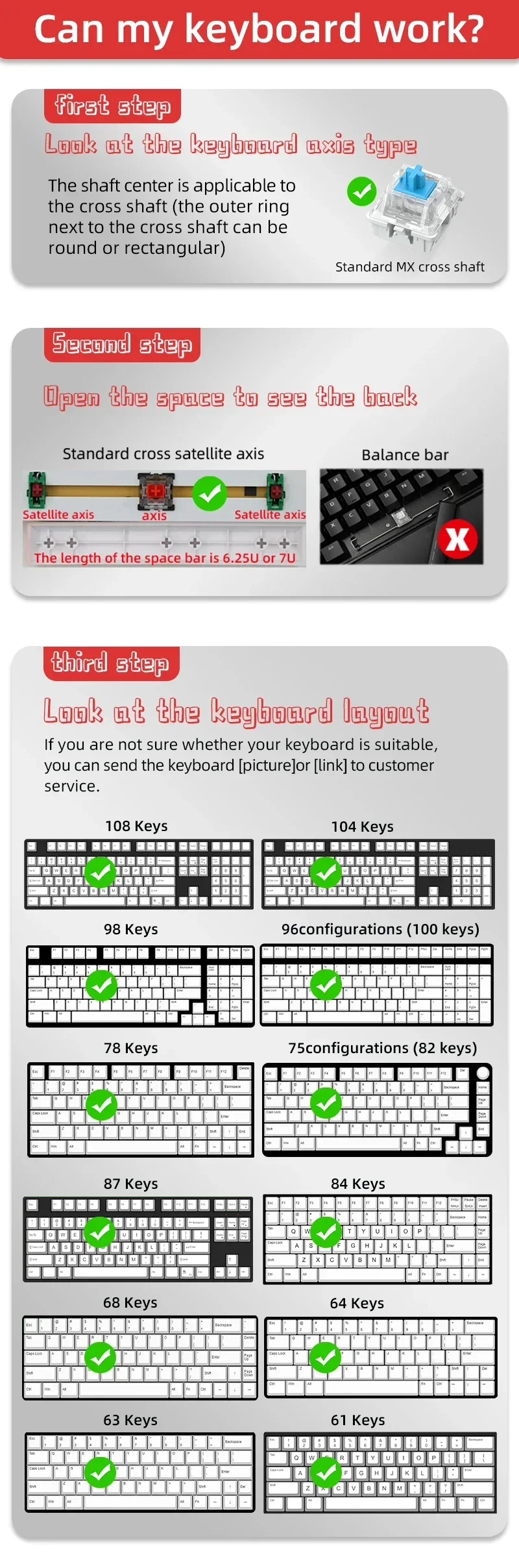 【Compatible con la mayoría de los teclados mecánicos】 este juego de teclas funciona con la mayoría de los DZ60/GK61/63/64/68/KBD75/81/82/83/87/96 (100 teclas)/98/102/104/108 Cherry MX Mecanical Gaming Switches Teclado y Outemu,