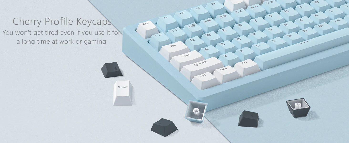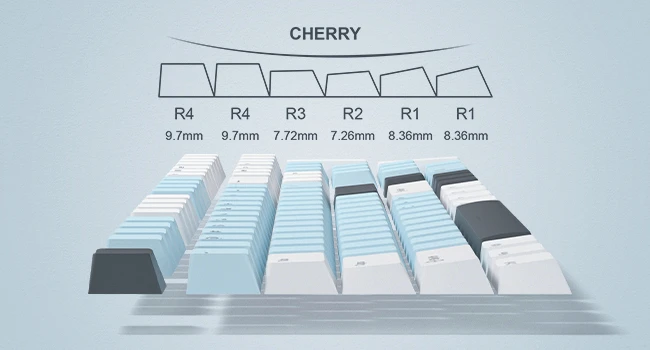 Teclas completas de perfil Cherry adecuadas para un diseño ergonómico y fáciles de instalar. Tecla baja suspendida, diseño curvo, le brinda una experiencia duradera y cómoda.