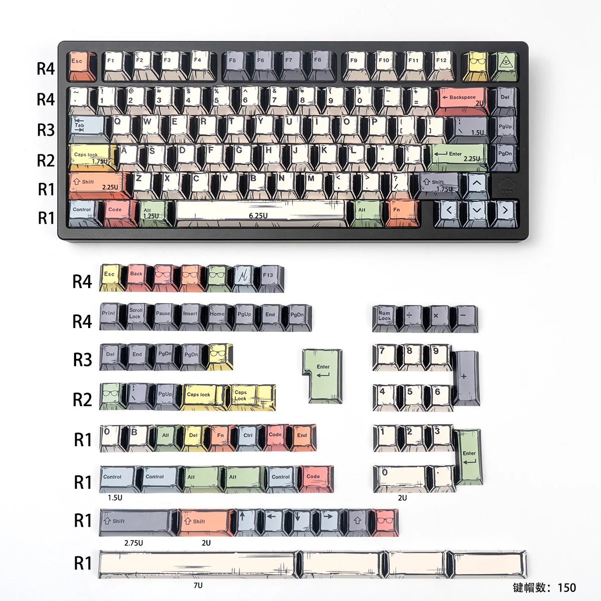 Teclas personalizadas: este juego de teclas de teclado mecánico de cómic retro se adapta a la mayoría de los teclados de 61 64 68 84 87 96 98 104 108 (60%/65%/80%/100%).Estas teclas son compatibles con todos los interruptores mx.,como interruptores Cherry MX, Gateron, Kailh y outemu, etc.