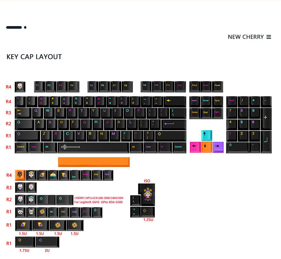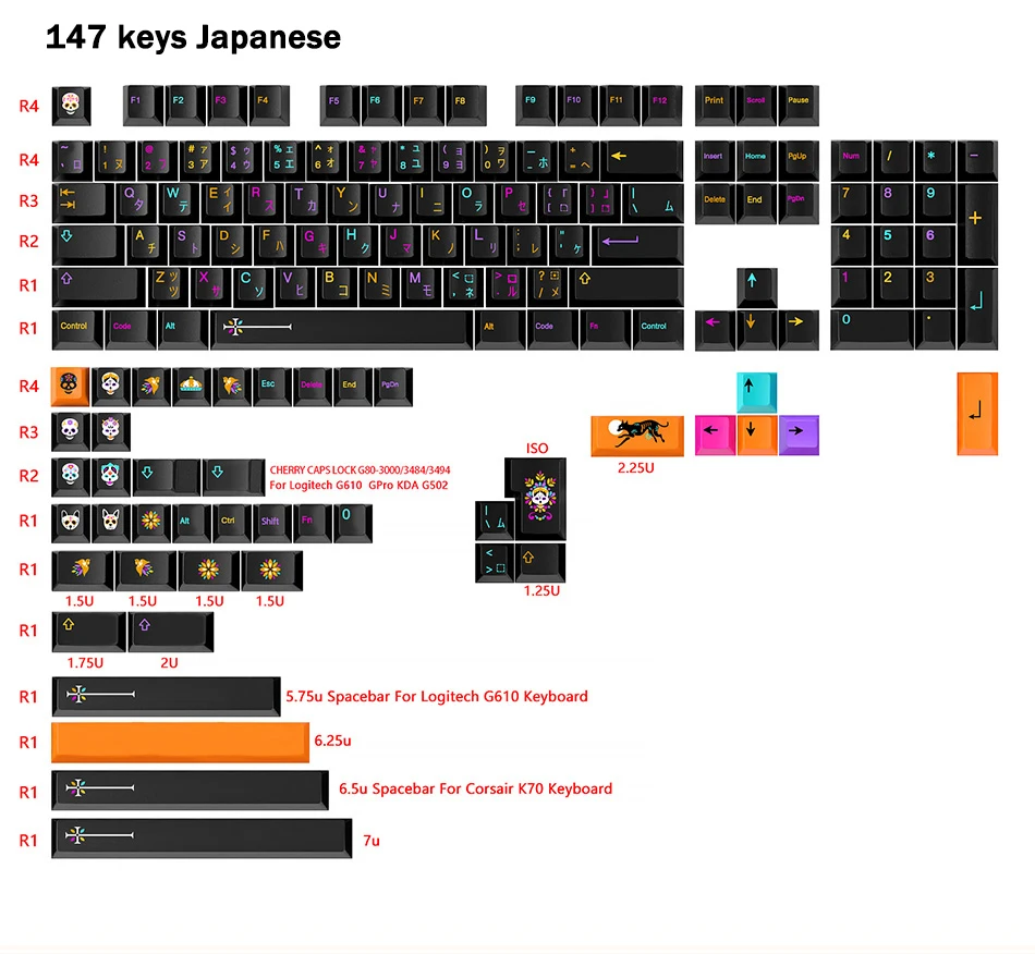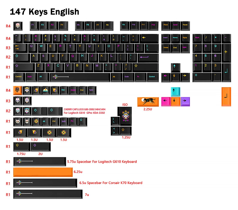 147 teclas, incluye cambio 1.75U 2U, 1.5U enovl, Barra espaciadora 6.25U 7U, Barra espaciadora 5.75U para teclado Logitech G610, Barra espaciadora 6.5U para teclado Corsair K70