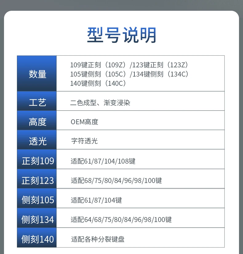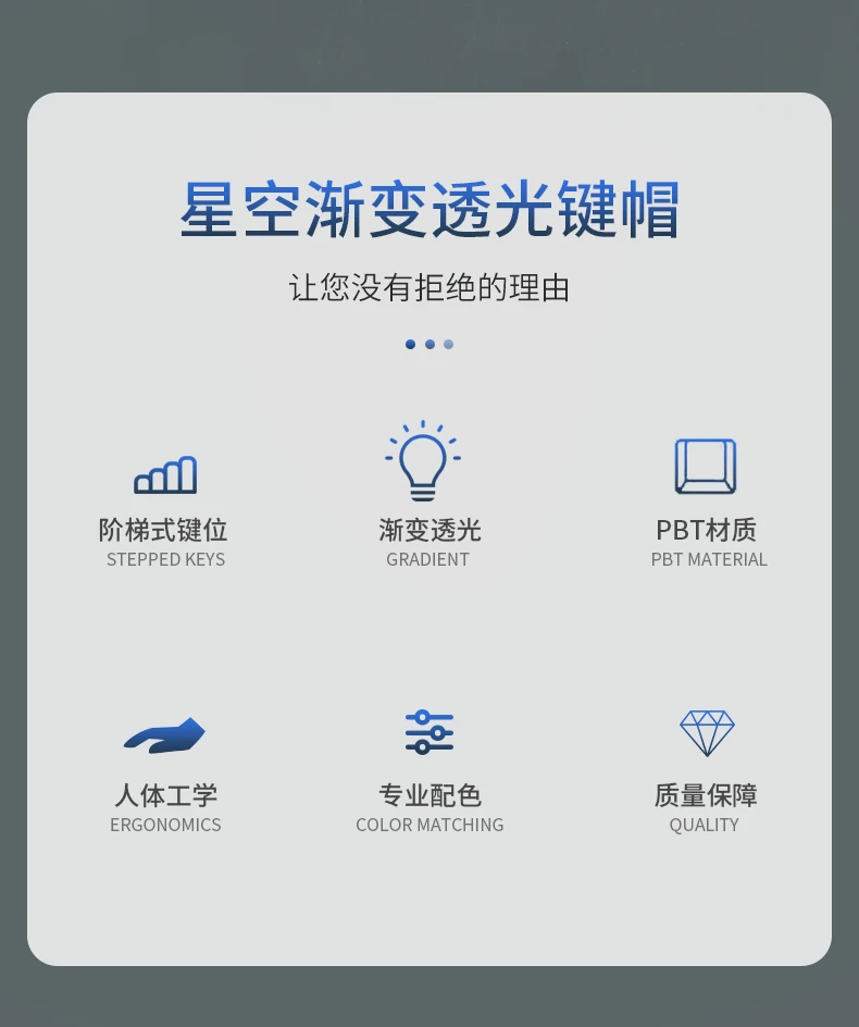 modname=ckeditor Teclas Starlit Sky para teclado mecánico azul PBT doble disparo OEM altura impresión lateral retroiluminación gradiente AULA F75 GK61 Anne ProEsto es solo teclas en lugar de teclado, NO TECLADO, ¡gracias a la nota!Material: PBTArtesanía: Doble tiroPerfil: perfil OEMPaquete: CAJALuz de fondo a través de: SÍNúmero de llaves:La versión con impresión superior de 109 teclas es compatible con el teclado mecánico de diseño 61 87 104 108 con interruptor MX.La versión con impresión lateral de 105 teclas es compatible con el teclado mecánico con diseño 61、87、104 con interruptor MX.La versión de impresión superior de 123 teclas es compatible con el teclado mecánico de diseño 61 64 68 75 80 84 87 96 980 100 104 108 con interruptor MX.La versión con impresión lateral de 134 teclas es compatible con el teclado mecánico de diseño 61 64 68 75 80 84 87 96 980 100 104 108 con interruptor MX.