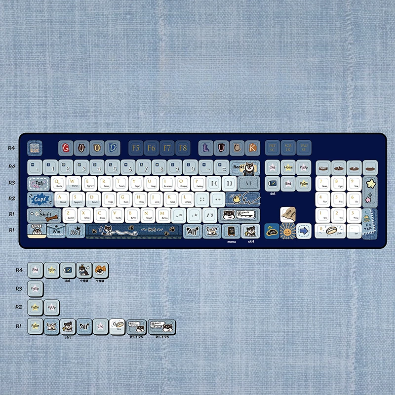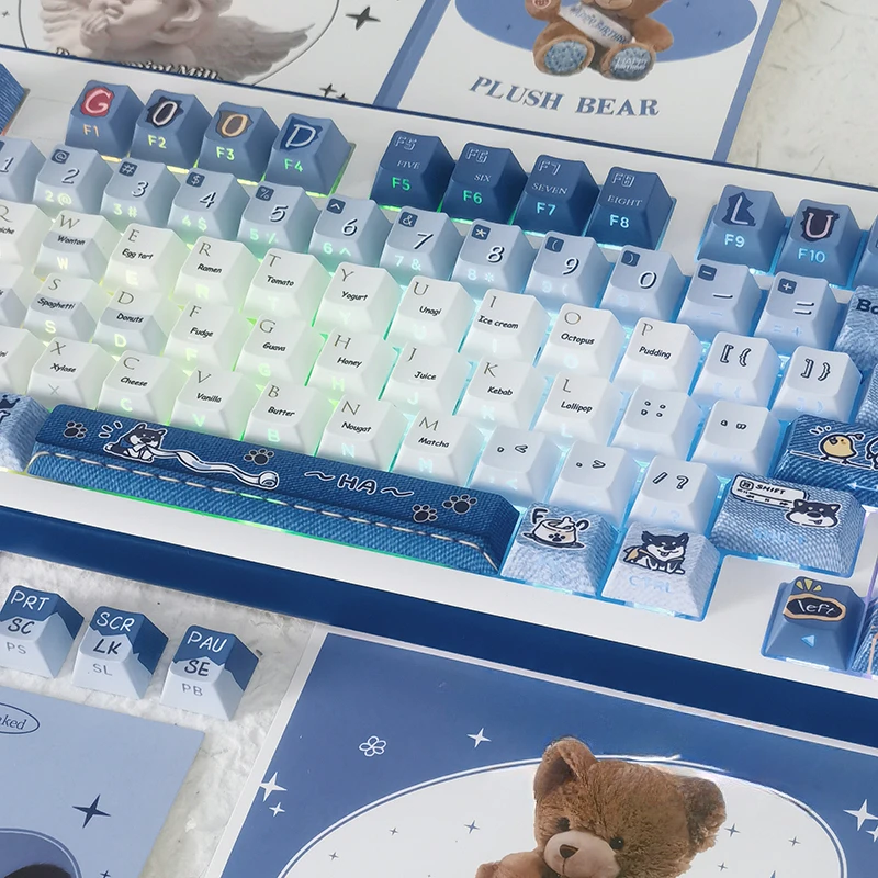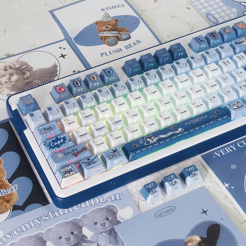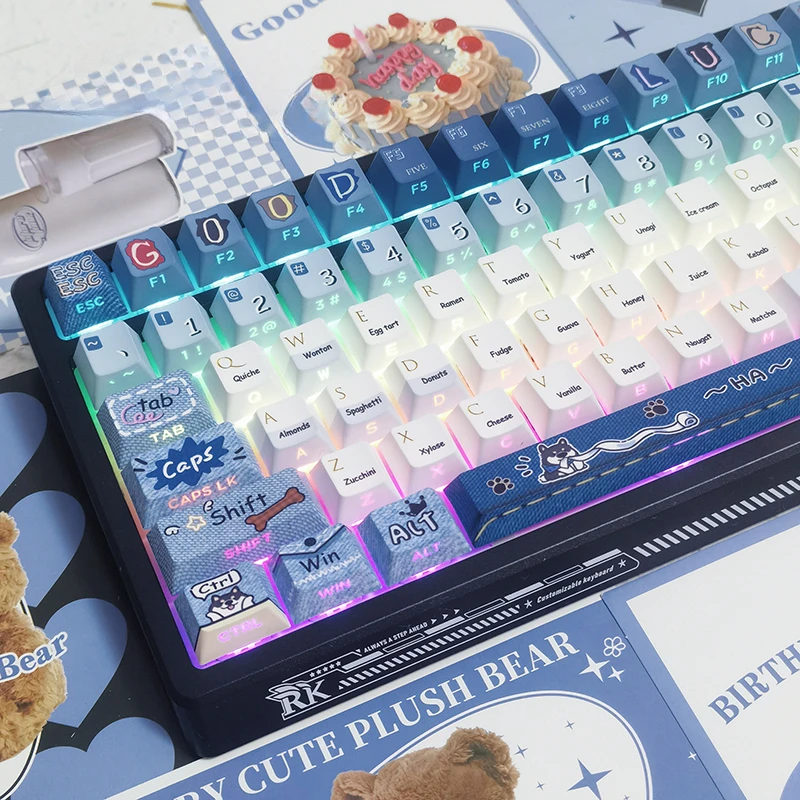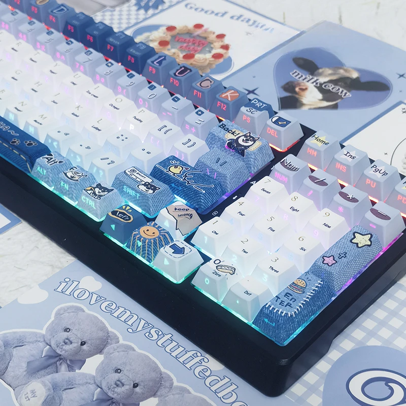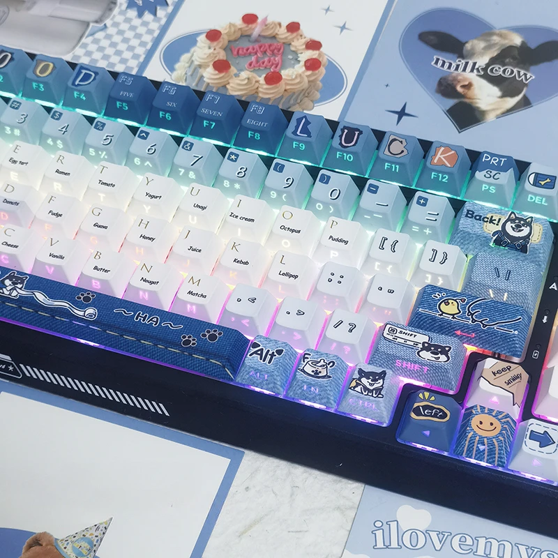 Teclas con temática de Cowboy Shiba Inu, teclas azules con grabado lateral de perfil de cereza, PBT, sublimación de calor, bonitas tapas para teclado de cachorro, 120 teclas
