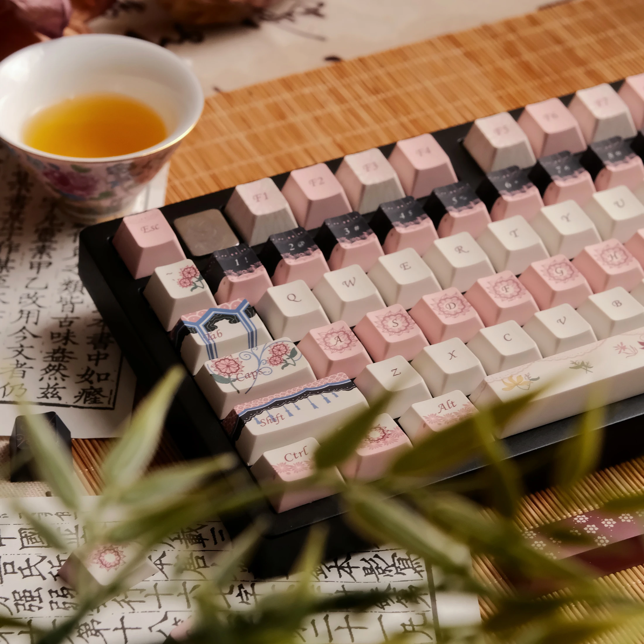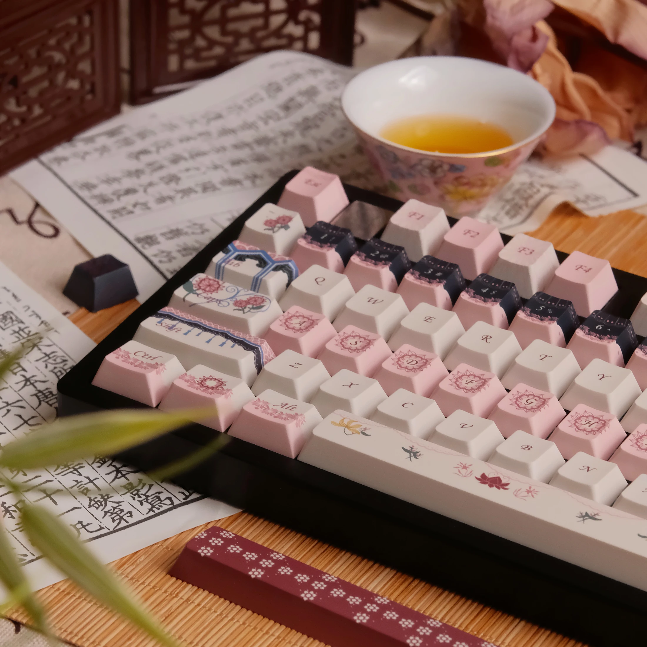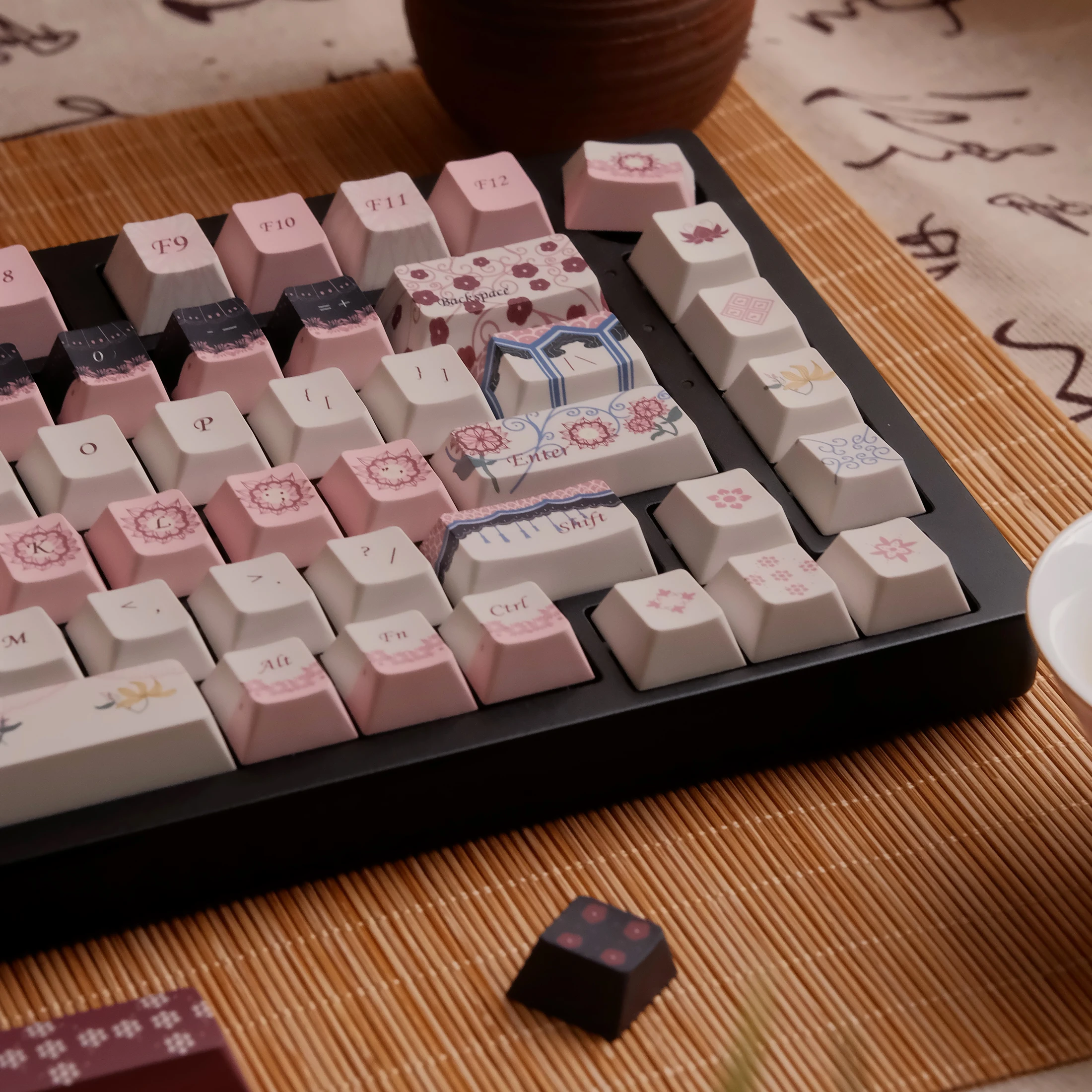 Teclas con temática de porcelana de flor de melocotón de estilo nacional, perfil de cereza, PBT, sublimación térmica, teclas rosas para teclado mecánico