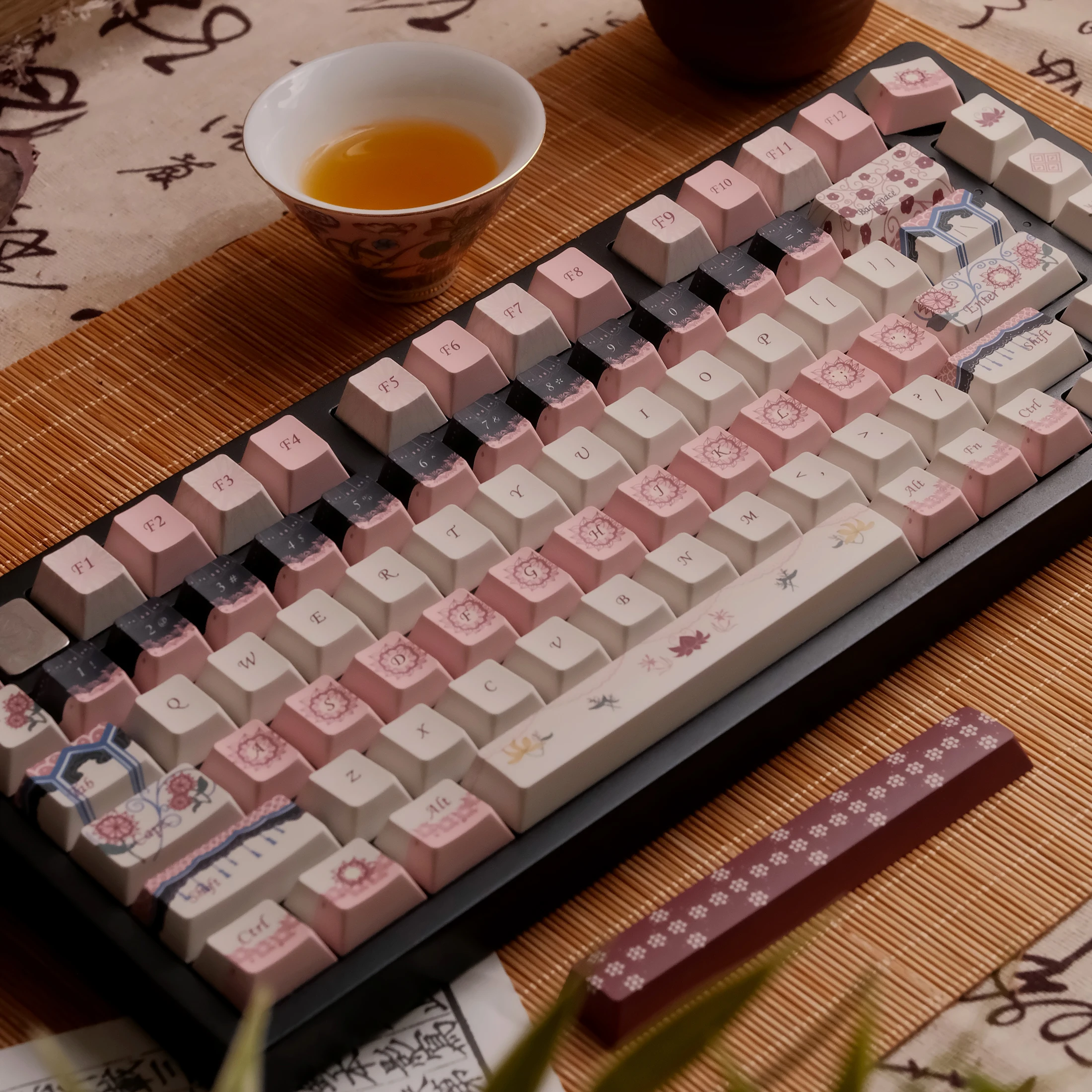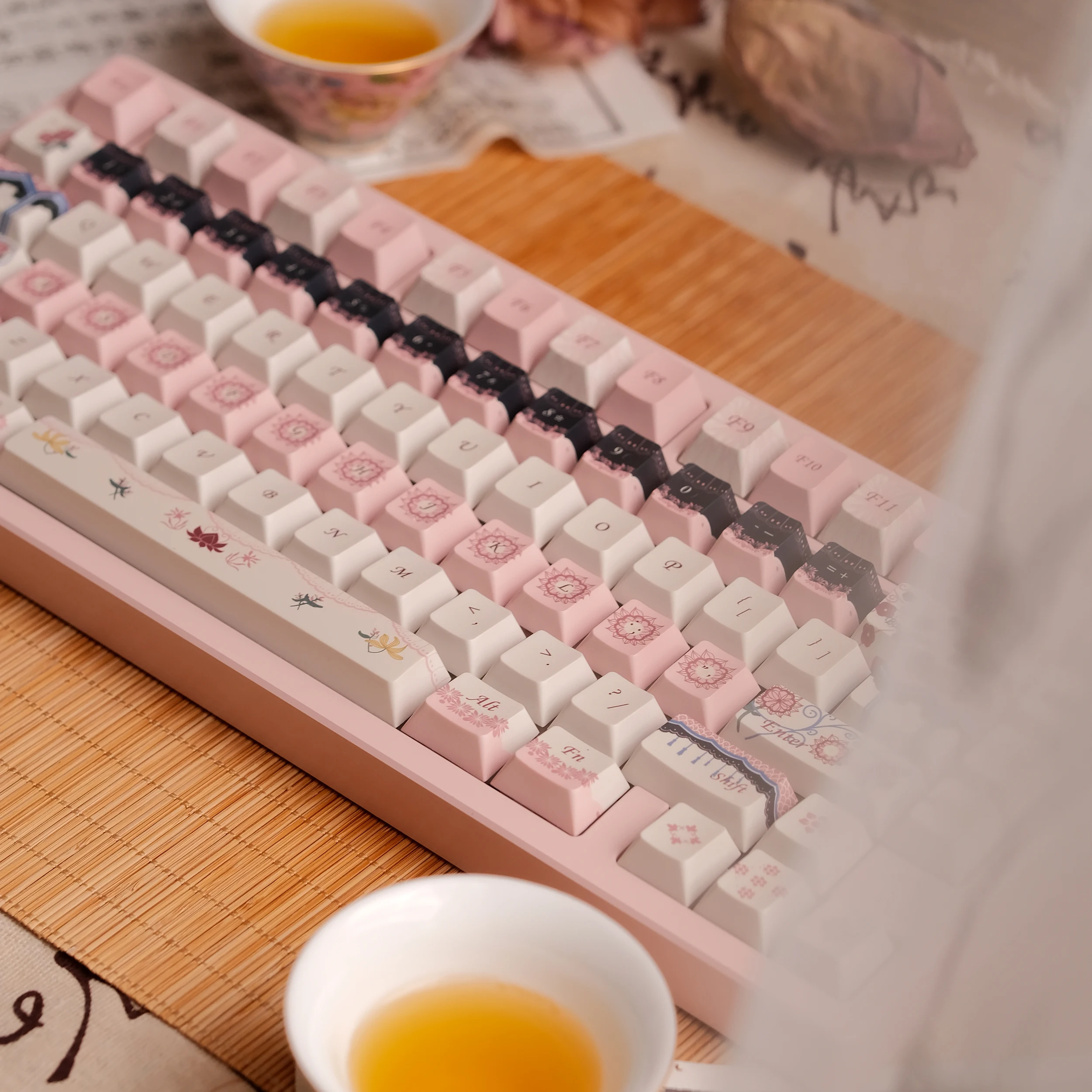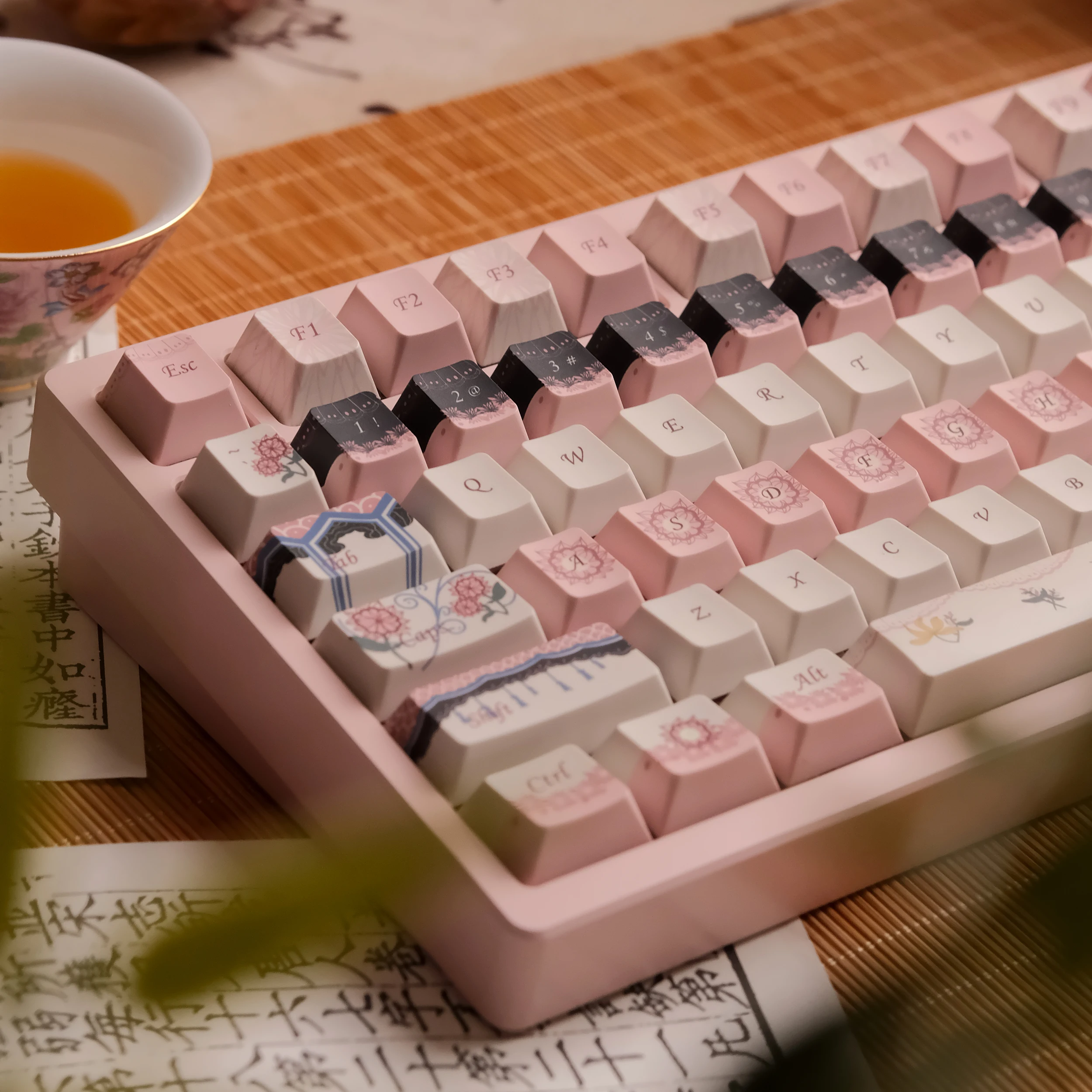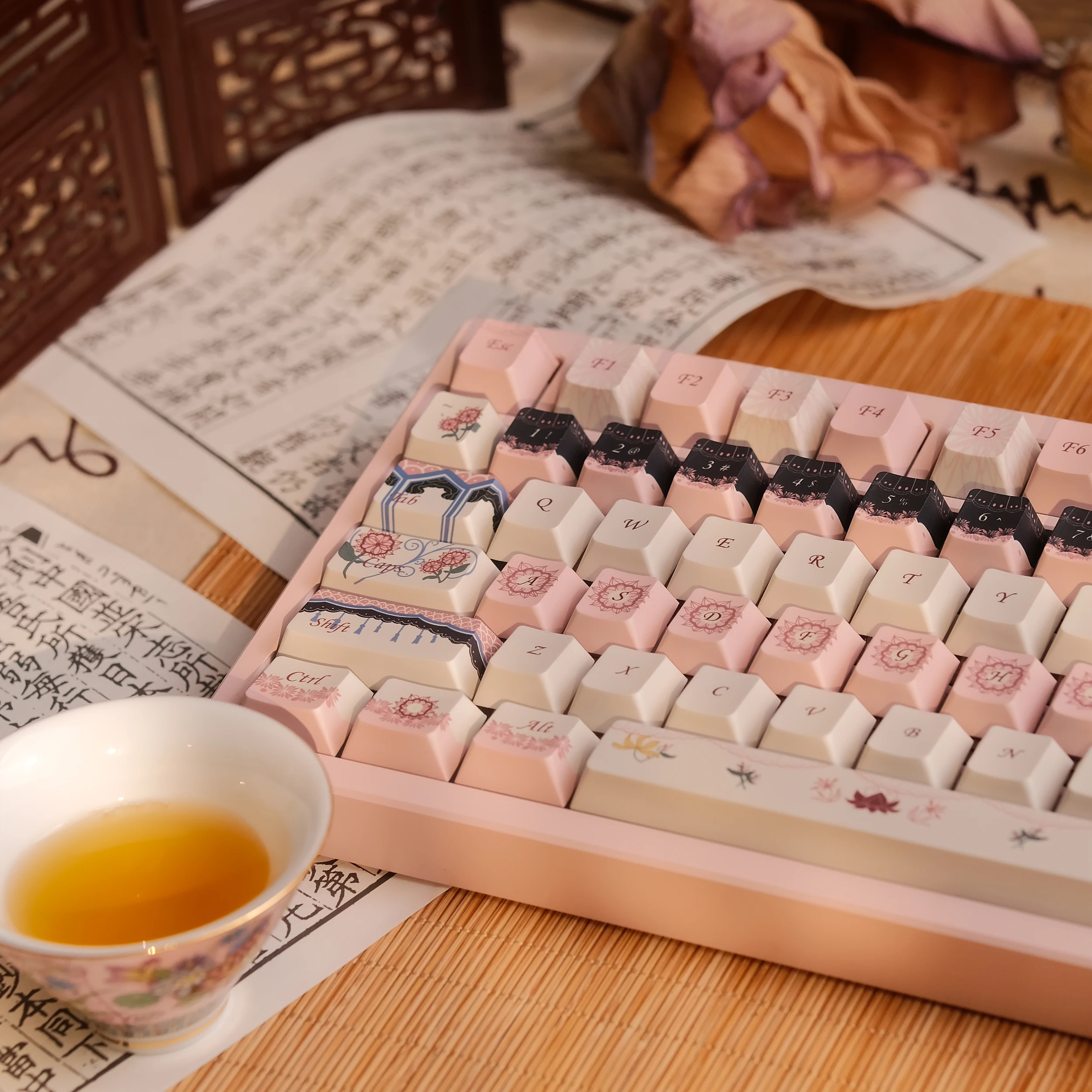 Teclas con temática de porcelana de flor de melocotón de estilo nacional, perfil de cereza, PBT, sublimación térmica, teclas rosas para teclado mecánico