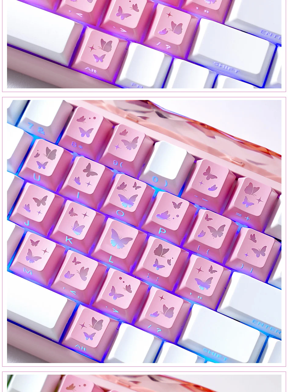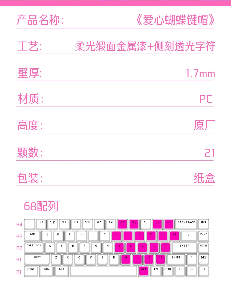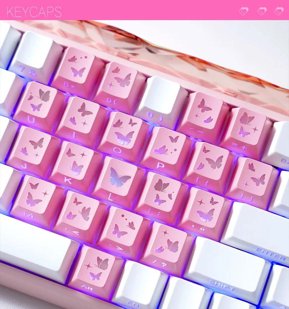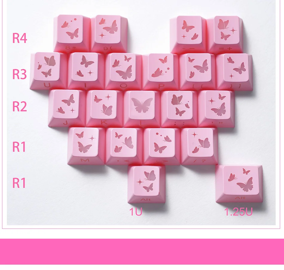 Teclas Translúcidas en Forma de Corazón, Color Rosa, 21 Teclas, Impresión Lateral, Acabado Satinado con Brillo Suave, Perfil Cherry, para DIY