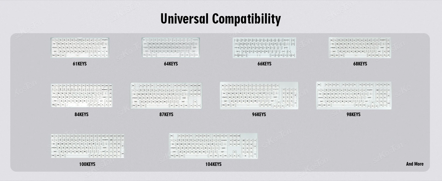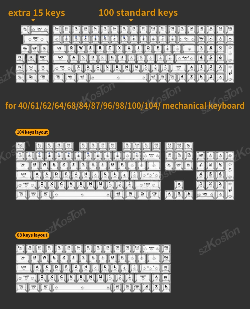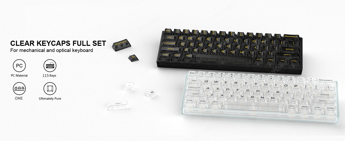 【Widely Compatible】Full 115 keys clear keycaps set, including 100 standard keys, suitable for 40/61/62/64/68/84/87/96/98/100/104/ mechanical keyboard.
