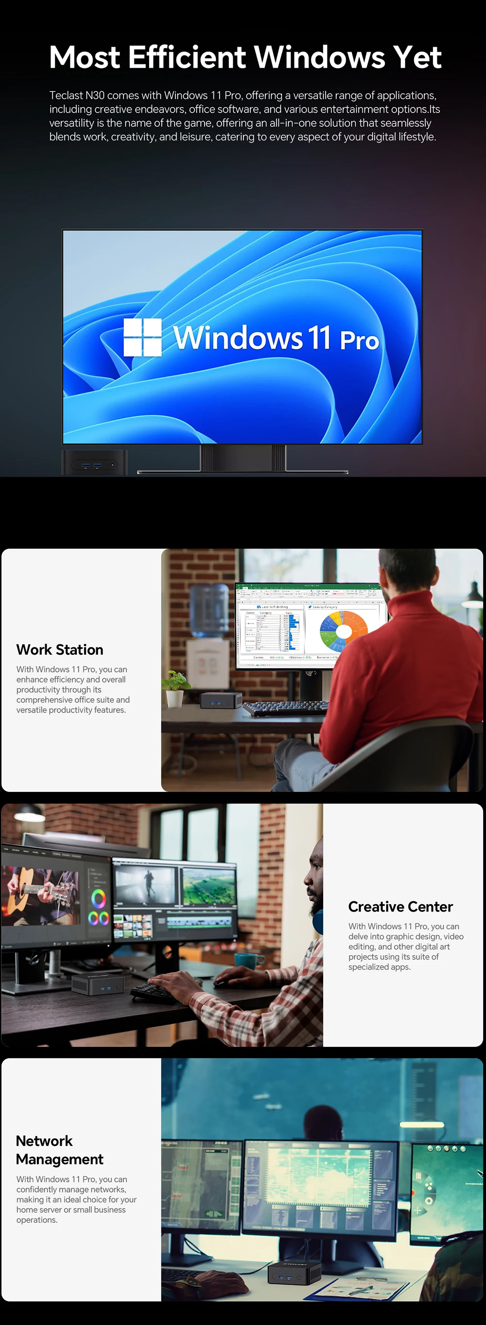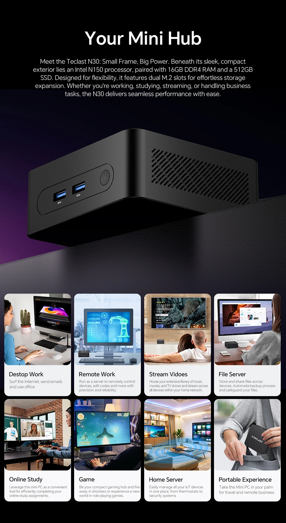 Un producto realmente potente para su tamaño, rápido y con una respuesta inmediata. Incluso con Windows 11 Pro, no se sobrecalienta mucho. Lo probé durante todo el día y no me decepcionó. Cargó varias páginas al mismo tiempo y la respuesta fue muy rápida. Lo conecté a un disco duro externo y no tuvo problemas. El diseño es apreciado, simple pero completo para mí y más que satisfactorio para mi uso: ver películas, escuchar música, fotos. Lo recomiendo.