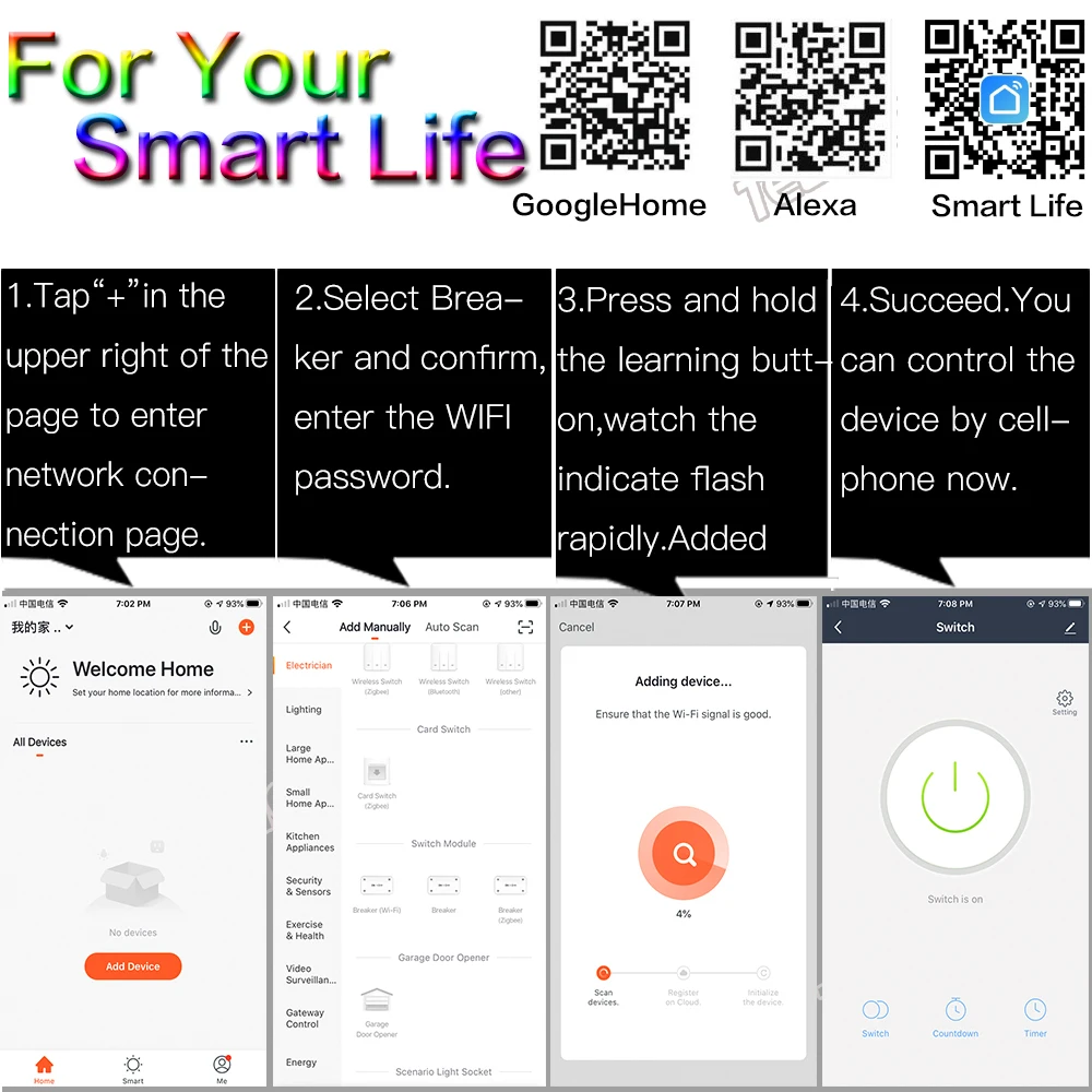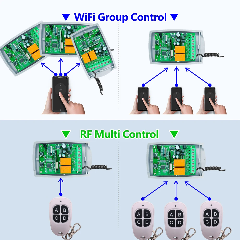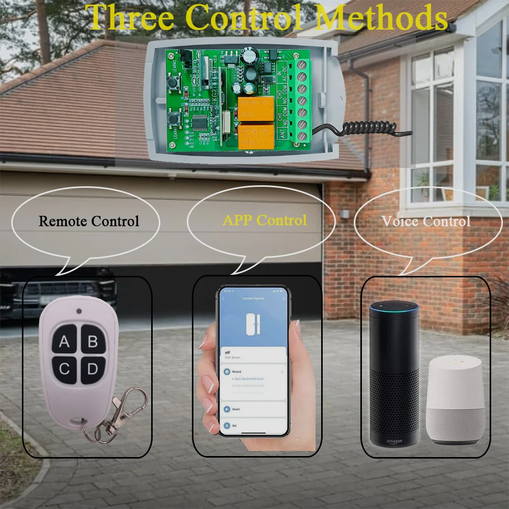 1. Potente receptor: este interruptor inteligente puede hacer que su garaje/puerta/luz sea fácil de controlar. Después de conectarse con su dispositivo, puede usar Teléfono + Voz + RF para controlarlo;