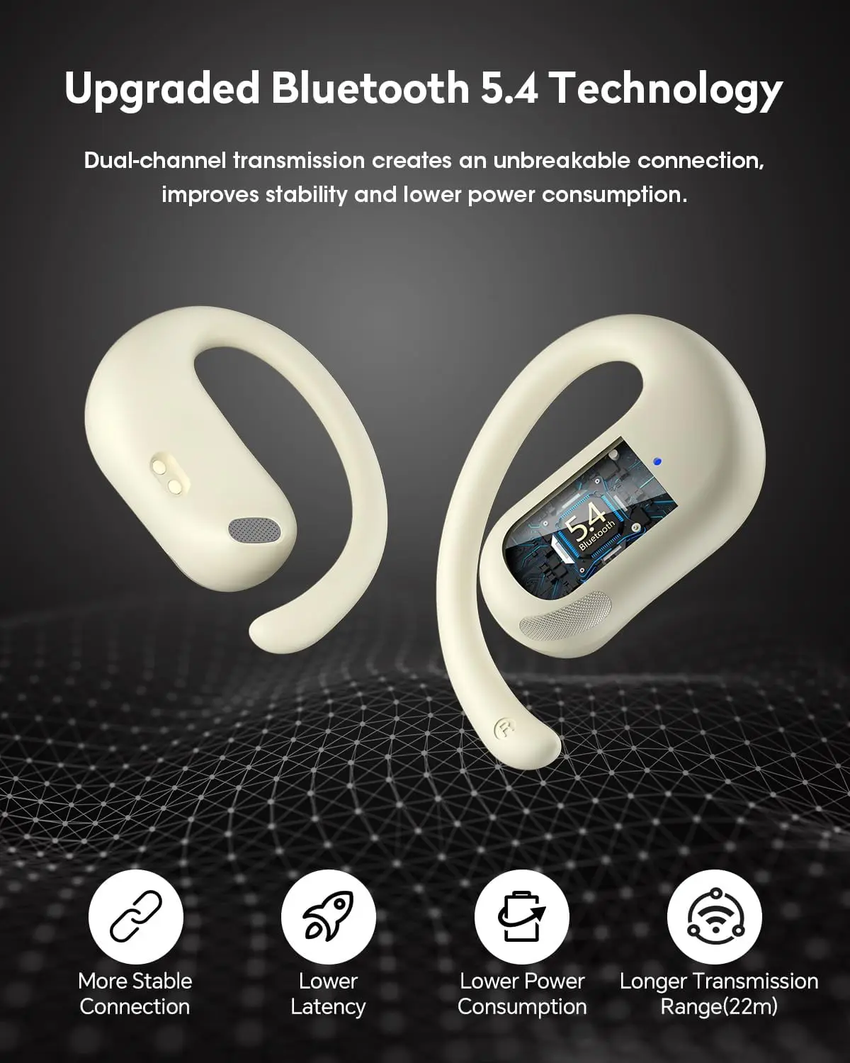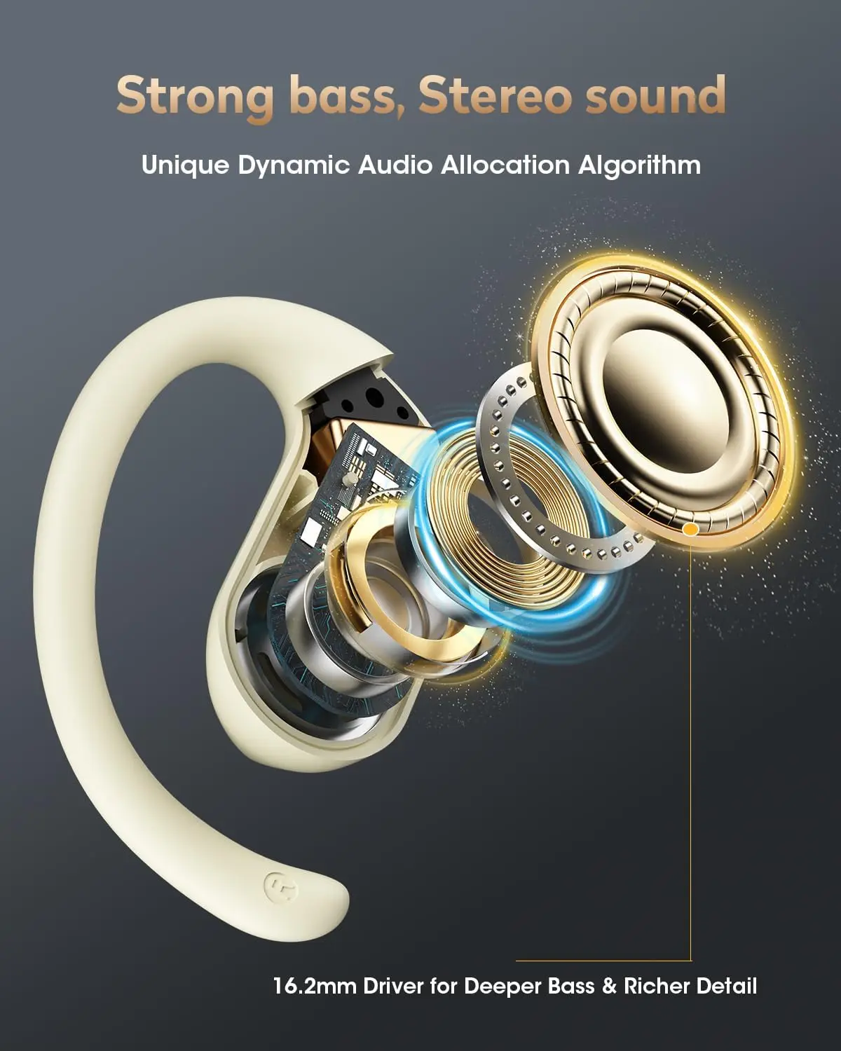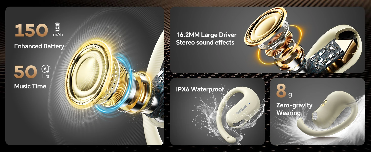 【Plancha sonora inmersiva】Redescubre tu música con el escenario sonoro inmersivo impulsado por controladores dinámicos de 16,2 mm. Sintonizado a medida por ingenieros de audio para graves profundos y agudos nítidos.Estos auriculares abiertos ofrecen graves profundos y un sonido estéreo claro para una experiencia auditiva rica y natural.Admite códec AAC/SBC para transmisión de audio HD en música. Compatible con asistente de voz con un solo toque. Modo de baja latencia de 30 ms, perfecto para maratones de películas.