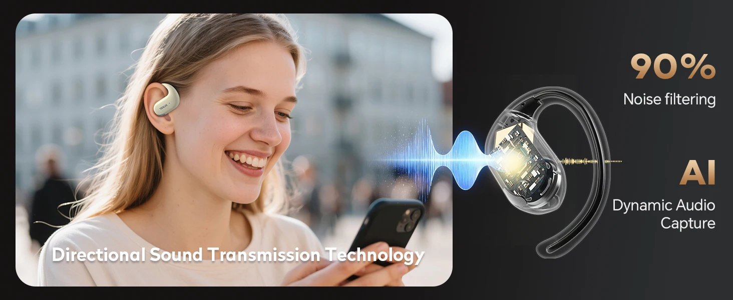 【Auriculares de oído abierto】 Experimente una verdadera conciencia situacional con auriculares de oído abierto que permiten una penetración del 95% del sonido ambiental.Nuestros controladores direccionales de 168,2 mm proyectan audio hacia adelante mientras mantienen las alertas de tráfico nítidas y críticas para corredores en entornos urbanos. La construcción impermeable IPX6 resiste la inmersión por lluvia intensa y sudor.Accesorios imprescindibles para ciclistas y corredores.