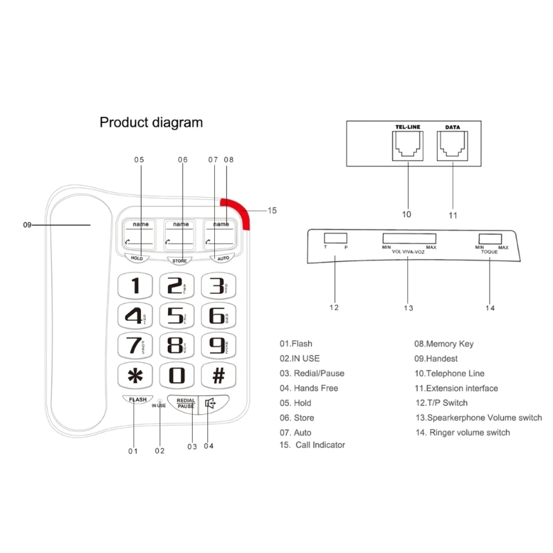 Para uso doméstico o de oficina, nuestro teléfono cuenta con botones grandes, sonido amplificado y un tono de llamada fuerte, lo que lo hace fácil de usar y escuchar.