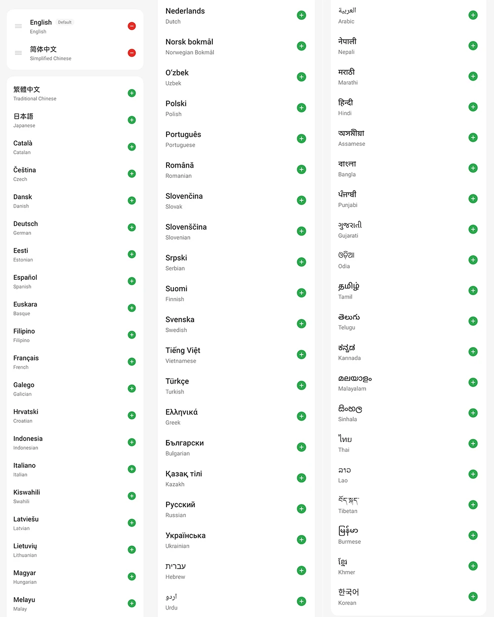 Catalán, checo, danés, alemán, estonio,Inglés, Español, Euskera, filipino,FrancésGallego, croata, Indonesio, italiano, swahili, letón, lituano, húngaro, malayo, holandés, noruego, uzbeko,Polaco, Portugués, Rumano, eslovaco, esloveno, serbio, finlandés, sueco, vietnamita, turco, griego, búlgaro, kazajo,Ruso, ucraniano, hebreo, Urdu, árabe, nepalí, Marathi, hindi, asamés, bengalí, punjabi, gujarati, Odia, Tamil, Telugu, kannada, malayalam, cingalés, tailandés, laosiano, tibetano, birmano, khmer,Coreano, japonésChino tradicional.