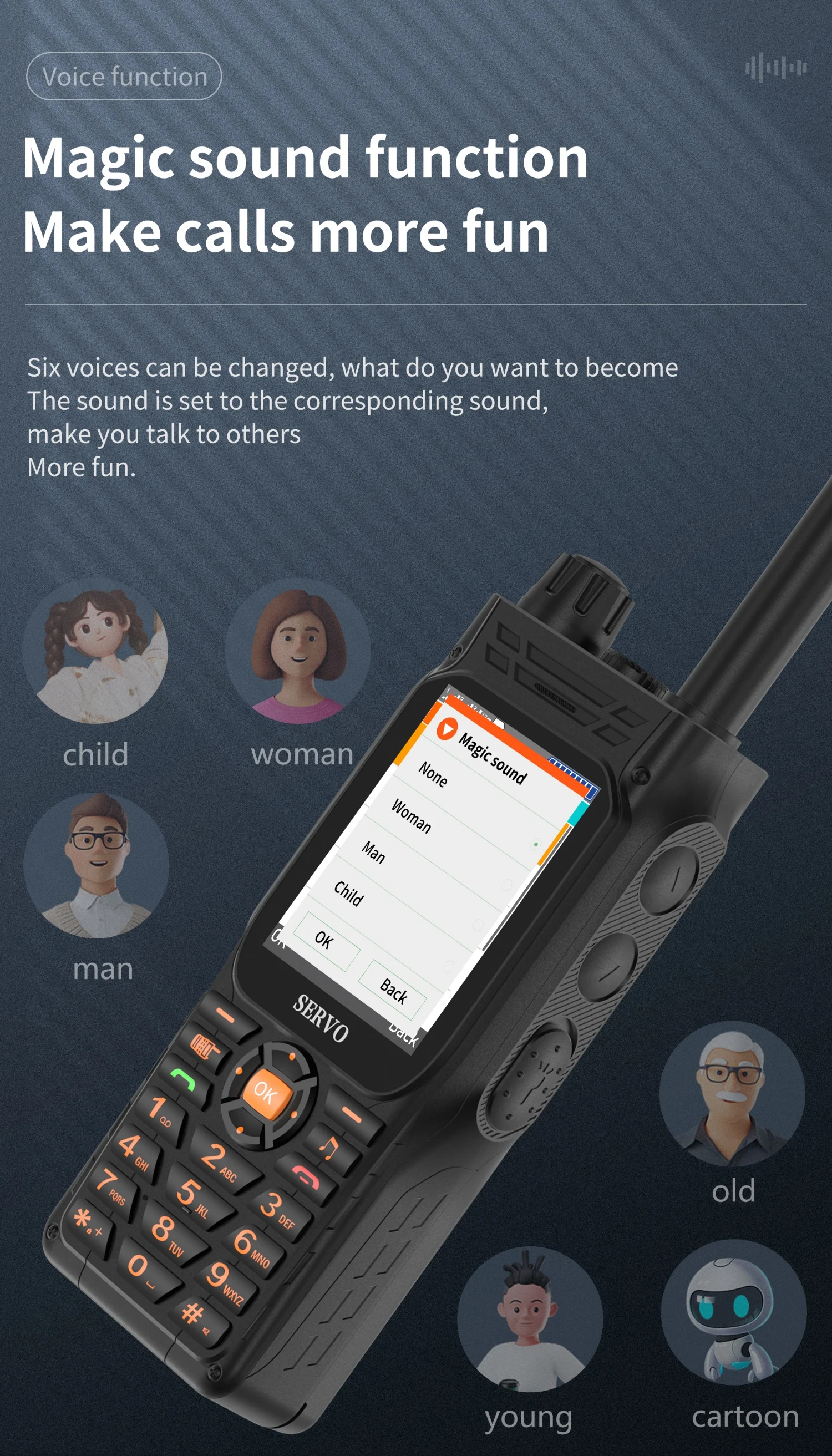 Hombre, mujer, niño, viejo, dibujos animados, joven, hay 6 sonidos para elegir. Hace que las llamadas sean más interesantes