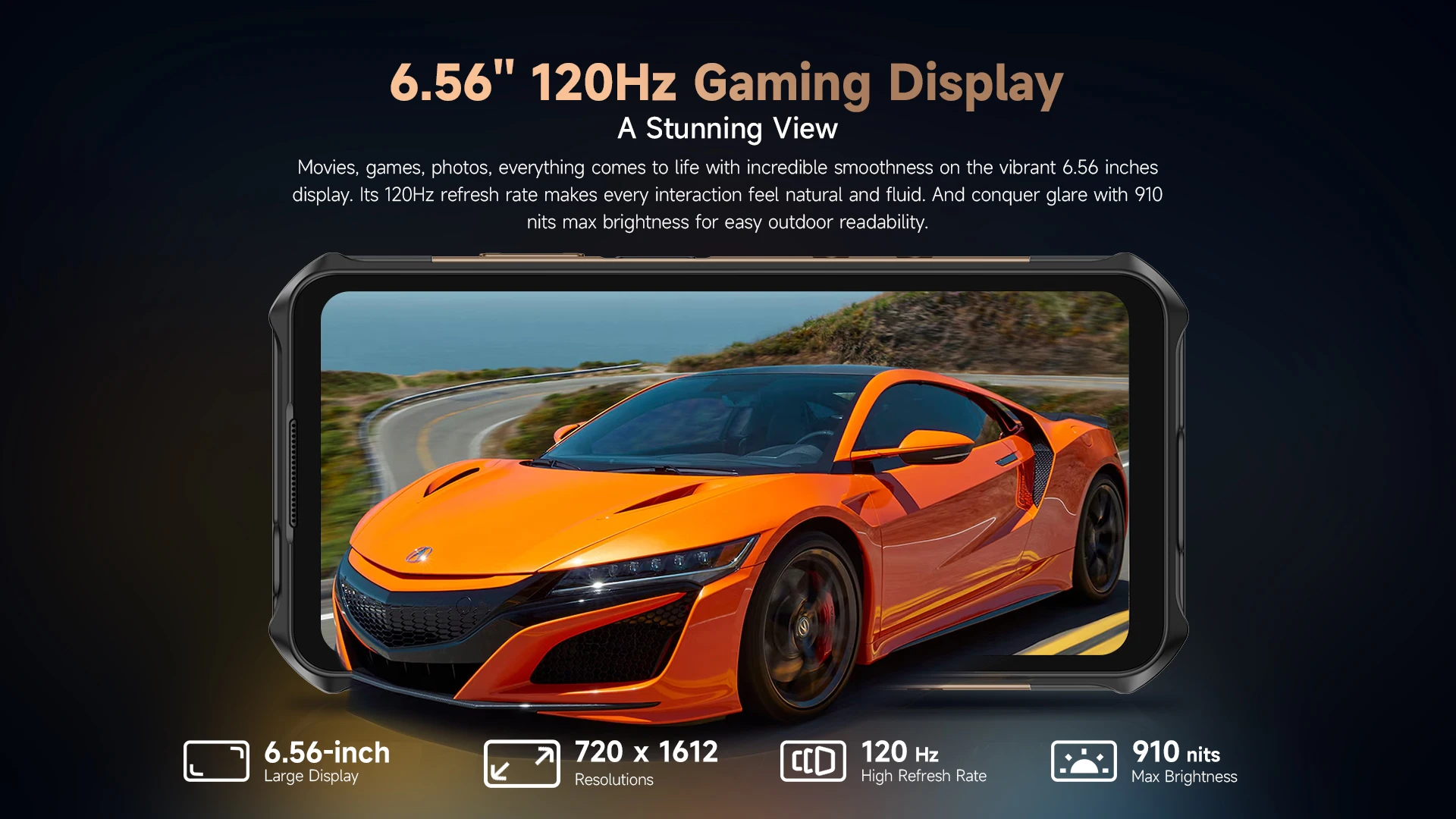 Películas, juegos, fotografías, todo cobra vida con una suavidad increíble en la vibrante pantalla de 6,56 pulgadas.Su frecuencia de actualización de 120 Hz hace que cada interacción se sienta natural y fluida.Y conquista el deslumbramiento con un brillo máximo de 910 nits para una fácil legibilidad en exteriores.