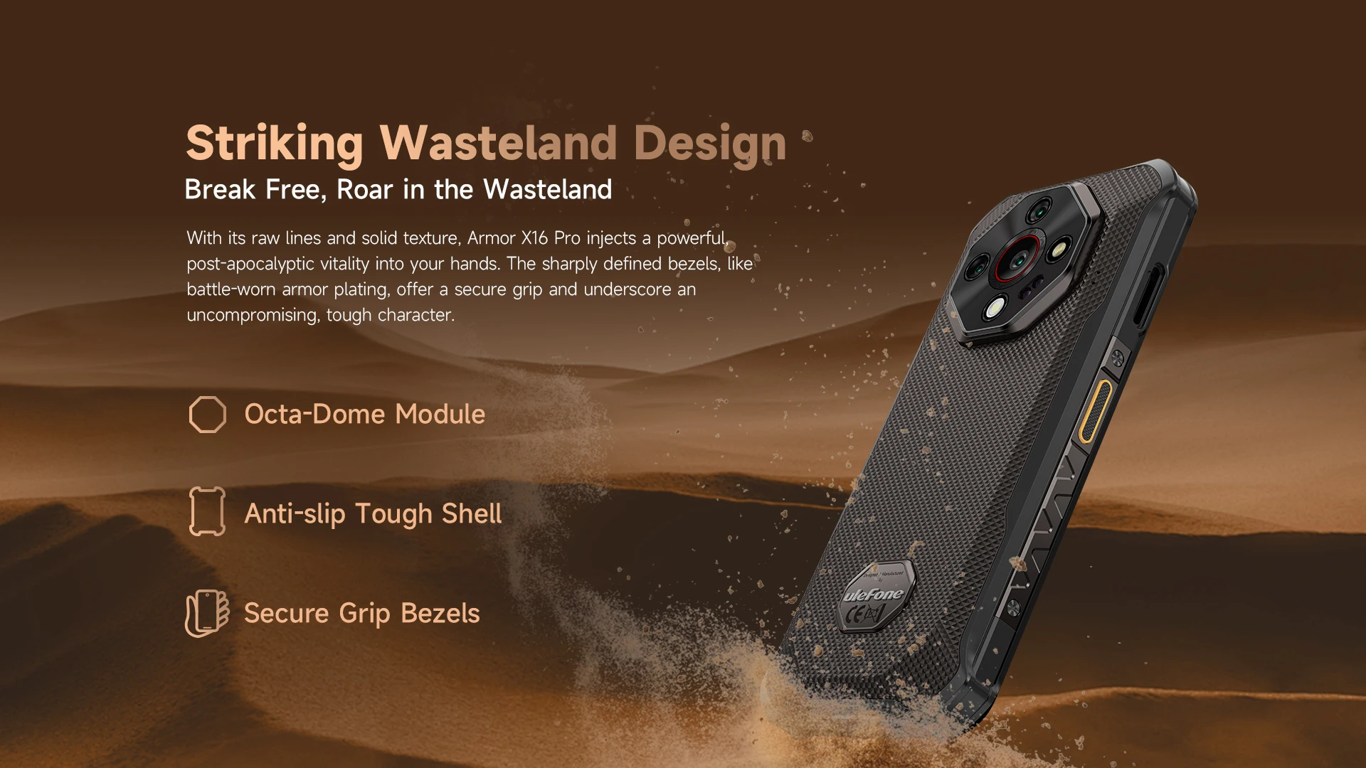 Con sus líneas crudas y su textura sólida, Armor X16 Pro inyecta en sus manos una poderosa vitalidad post-apocalíptica.Los biseles nítidos, como el revestimiento de armadura que se usa en batalla, ofrecen un agarre seguro y subren un carácter resistente y sin concesiones.