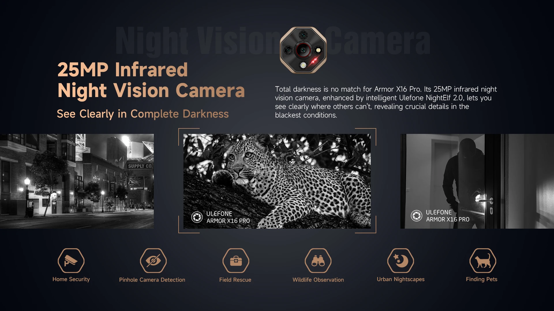 La oscuridad total no coincide con Armor X16 Pro.Su cámara de visión nocturna por infrarrojos de 25 MP, mejorada por Ulefone NightElf 2.0 inteligente, le permite ver claramente dónde otros no pueden, revelando detalles cruciales en las condiciones más negras.