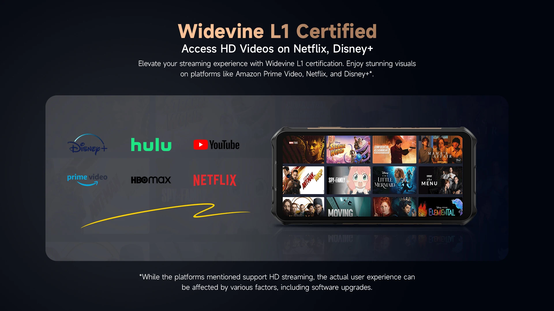 Mejore su experiencia de transmisión con la certificación Widevine L1.Disfrute de imágenes impresionantes en plataformas como Amazon Prime Video, Netflix y Disney+*.