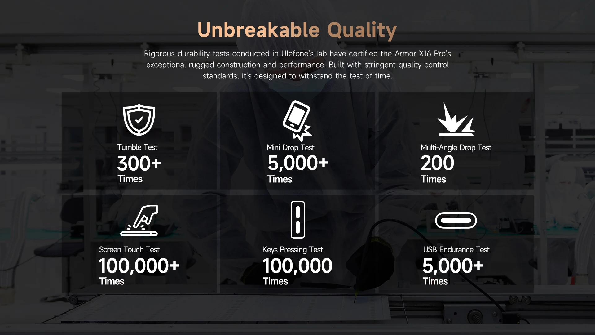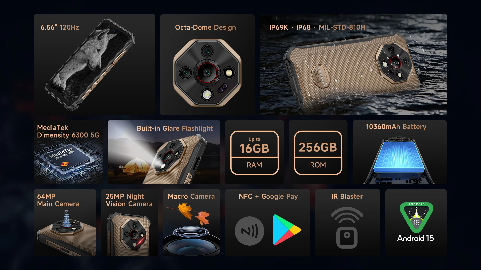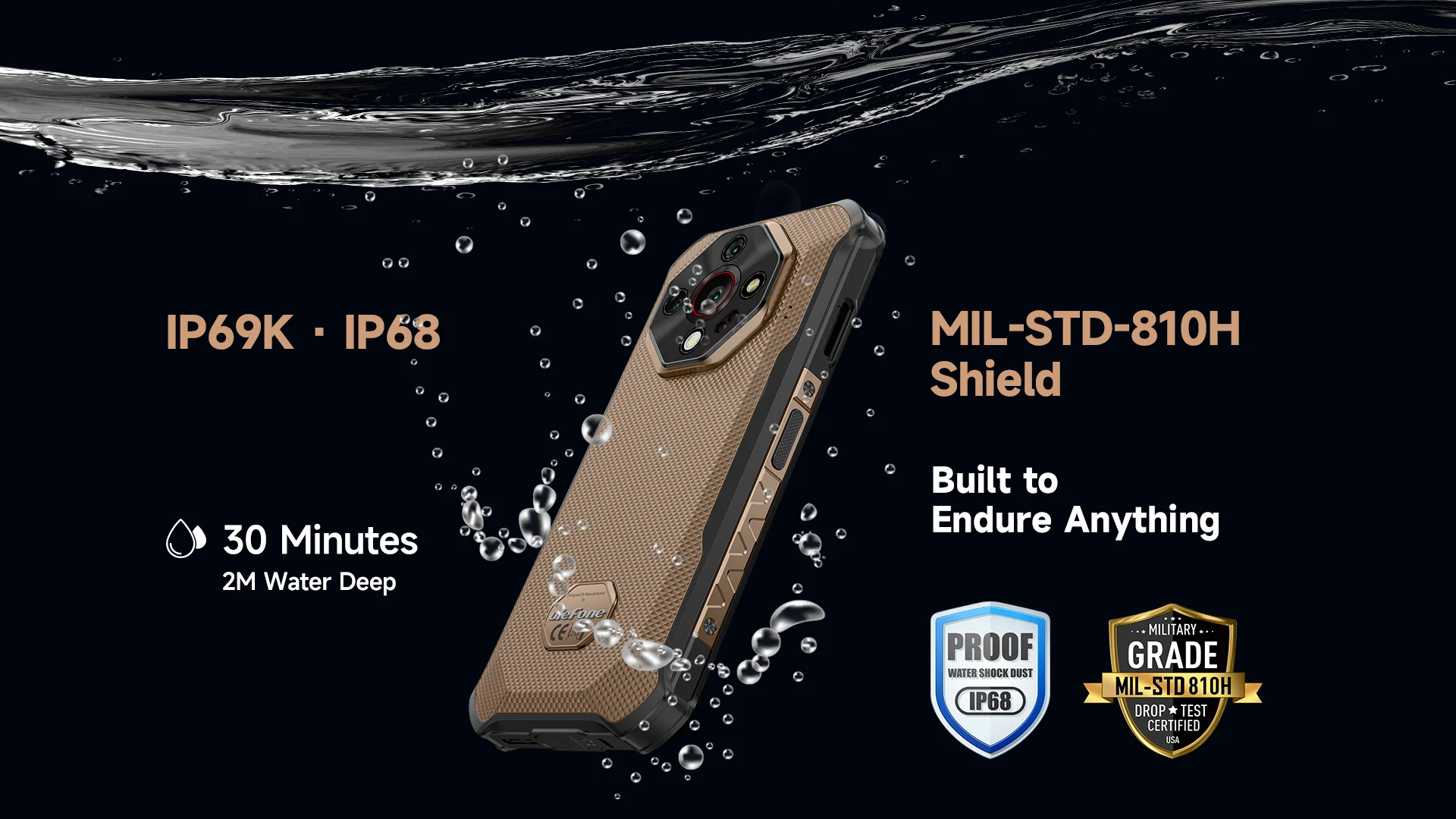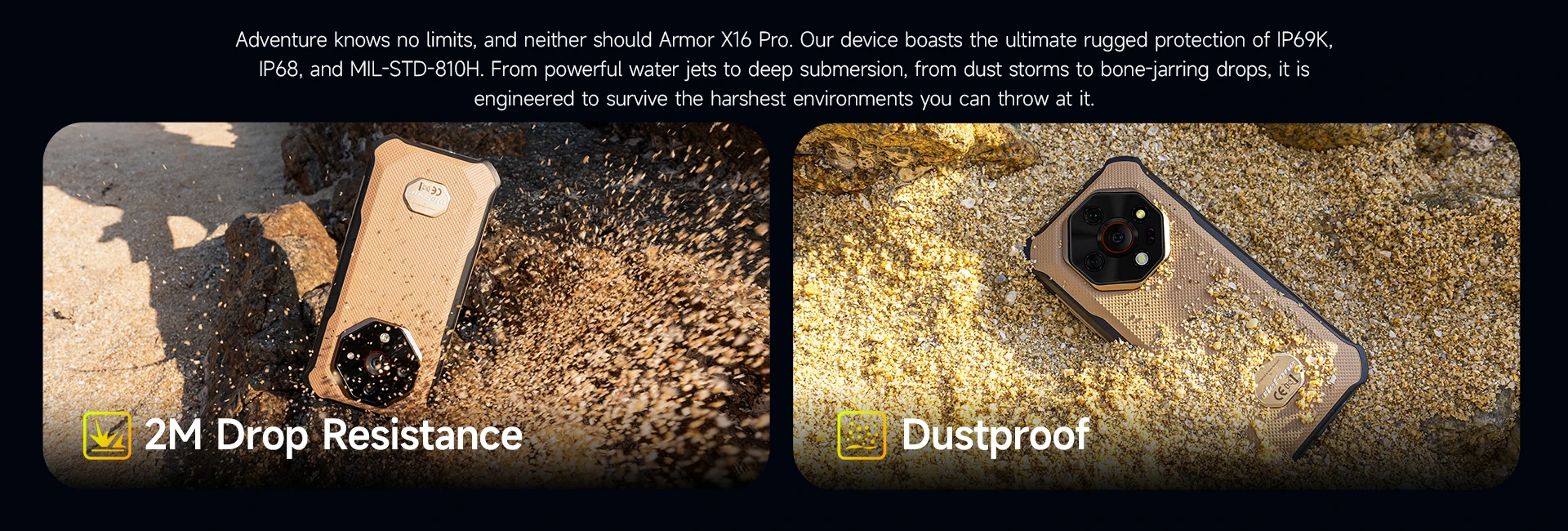 Adventure no conoce límites y tampoco debería Armor X16 Pro.Nuestro dispositivo cuenta con la máxima protección robusta de IP69K, IP68 y MIL-STD-810H.Desde potentes chorros de agua hasta inmersión profunda, desde tormentas de polvo hasta caídas de espiga ósea, está diseñado para sobrevivir a los entornos más hostiles que puede lanzar.