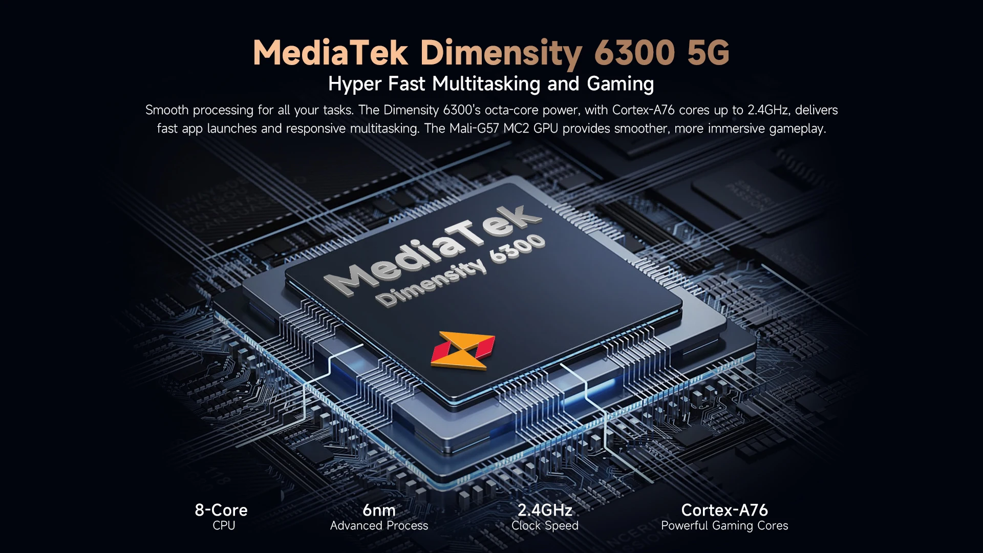 Procesamiento fluido para todas sus tareas.La potencia octa-core del Dimensity 6300, con núcleos Cortex-A76 de hasta 2,4 GHz, ofrece lanzamientos rápidos de aplicaciones y multitarea receptiva.La GPU Mali-G57 MC2 proporciona un juego más fluido y envolvente.