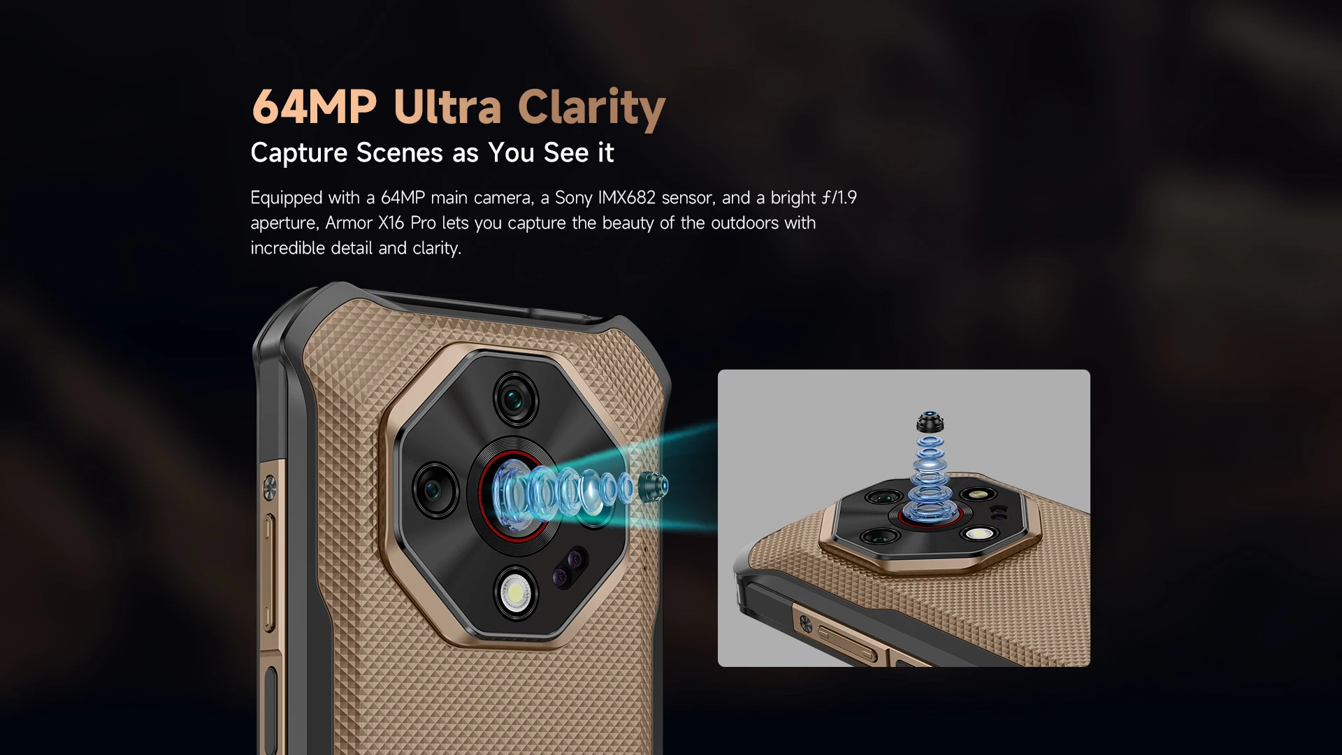 Equipado con una cámara principal de 64 MP, un sensor Sony IMX682 y una apertura brillante ƒ/1.9, Armor X16 Pro le permite capturar la belleza del aire libre con increíbles detalles y claridad.
