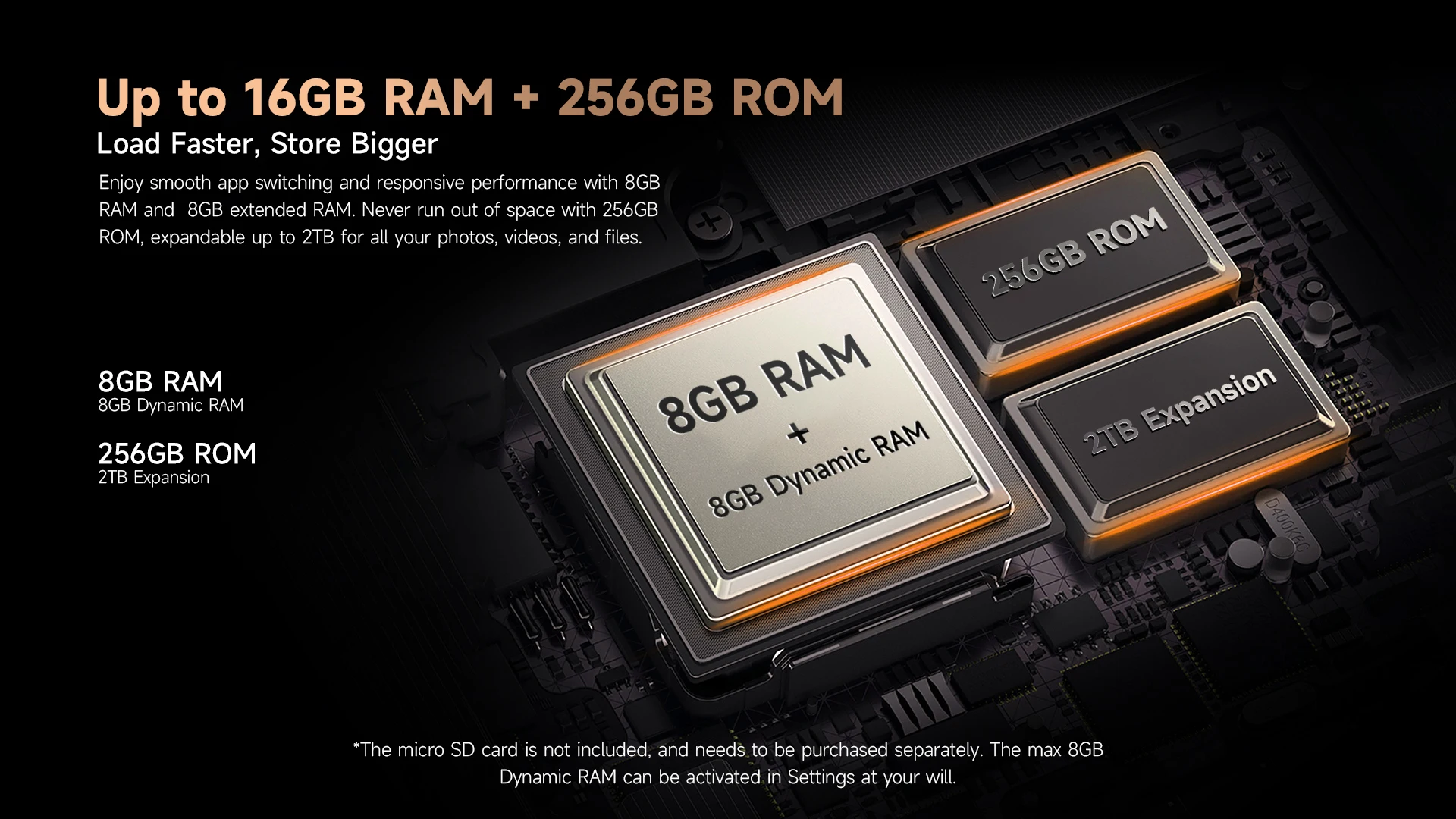 *La tarjeta micro SD no está incluida y debe comprarse por separado.El máximo de 8 GB de RAM dinámica se puede activar en Configuración a su voluntad.