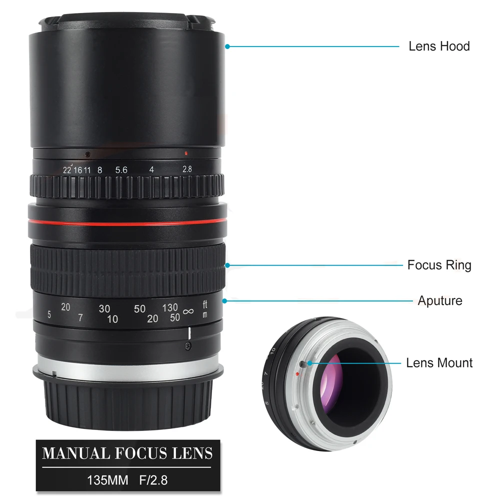 Teleobjetivo de marco completo UMC de 135mm f/2.8 FE para cámara Canon Rebel EOS 80D 77D 70D 6D 1300D 6DII 7DII 77D Nikon DSLR