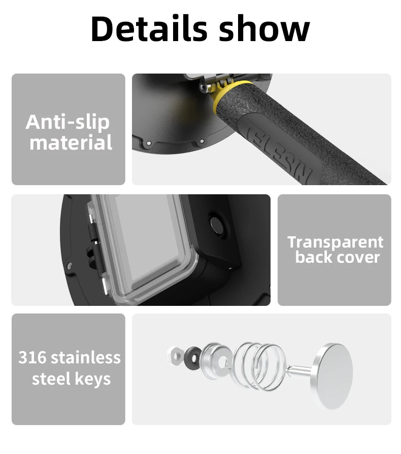 1. Botón de carcasa impermeable hecho con material especial de acero inoxidable 316, no se oxida fácilmente. Amplia la cabeza del botón, protege el botón de la cámara.