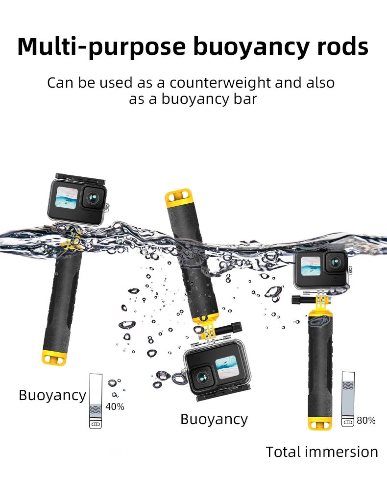 Empuñadura flotante de 2,8 pulgadas, con orificio de tornillo estándar de 1/4, antideslizante y ahorra trabajo. Se puede utilizar para añadir agua (para lograr una flotabilidad neutra bajo el agua) o almacenar artículos pequeños. También se puede utilizar por separado.