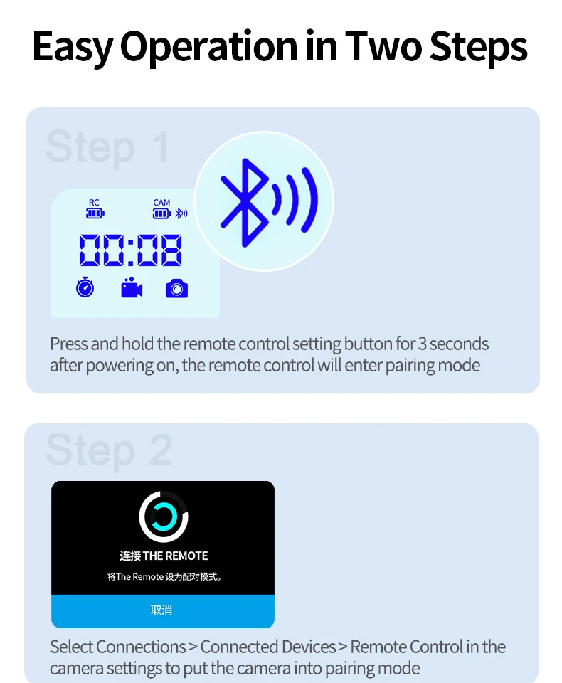 2. Al usar la cámara por primera vez, primero empareja la cámara con el control remoto, luego puedes usar el control remoto para encender y apagar la cámara.