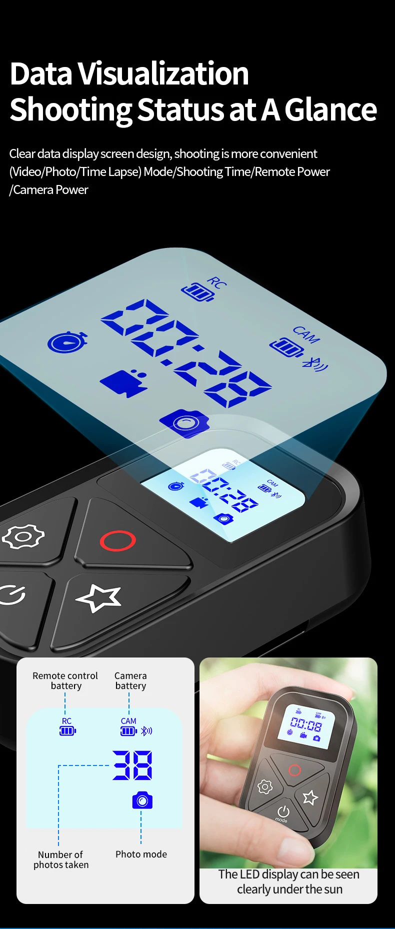 3. Pantalla LED de visualización de datos claros, video, foto, modo de lapso de tiempo/tiempo de disparo/alimentación remota/potencia de la cámara visible en cualquier momento.