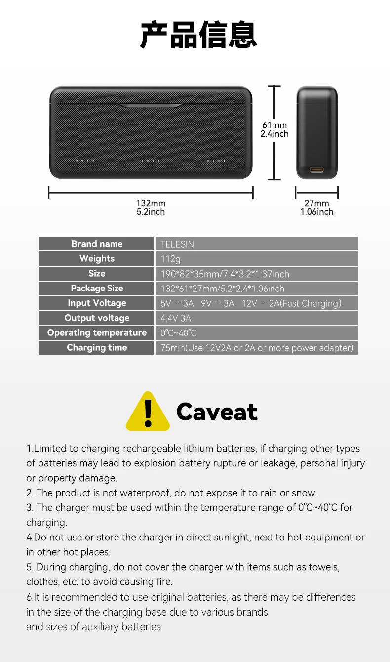 【Estuche de cargador de almacenamiento portátil】Este estuche de carga del tamaño de la palma de la mano con tapa le permite cargar sus baterías en cualquier momento durante viajes y sesiones de fotografía.Cuenta con una entrada tipo C que admite 5 V 3 A/9 V 3 A/12 V 2 A (voltaje recomendado de carga rápida).Cuando se utiliza 12V 2A, puede cargar completamente la batería en 75 minutos.La batería está completamente cargada cuando la luz indicadora se vuelve verde.