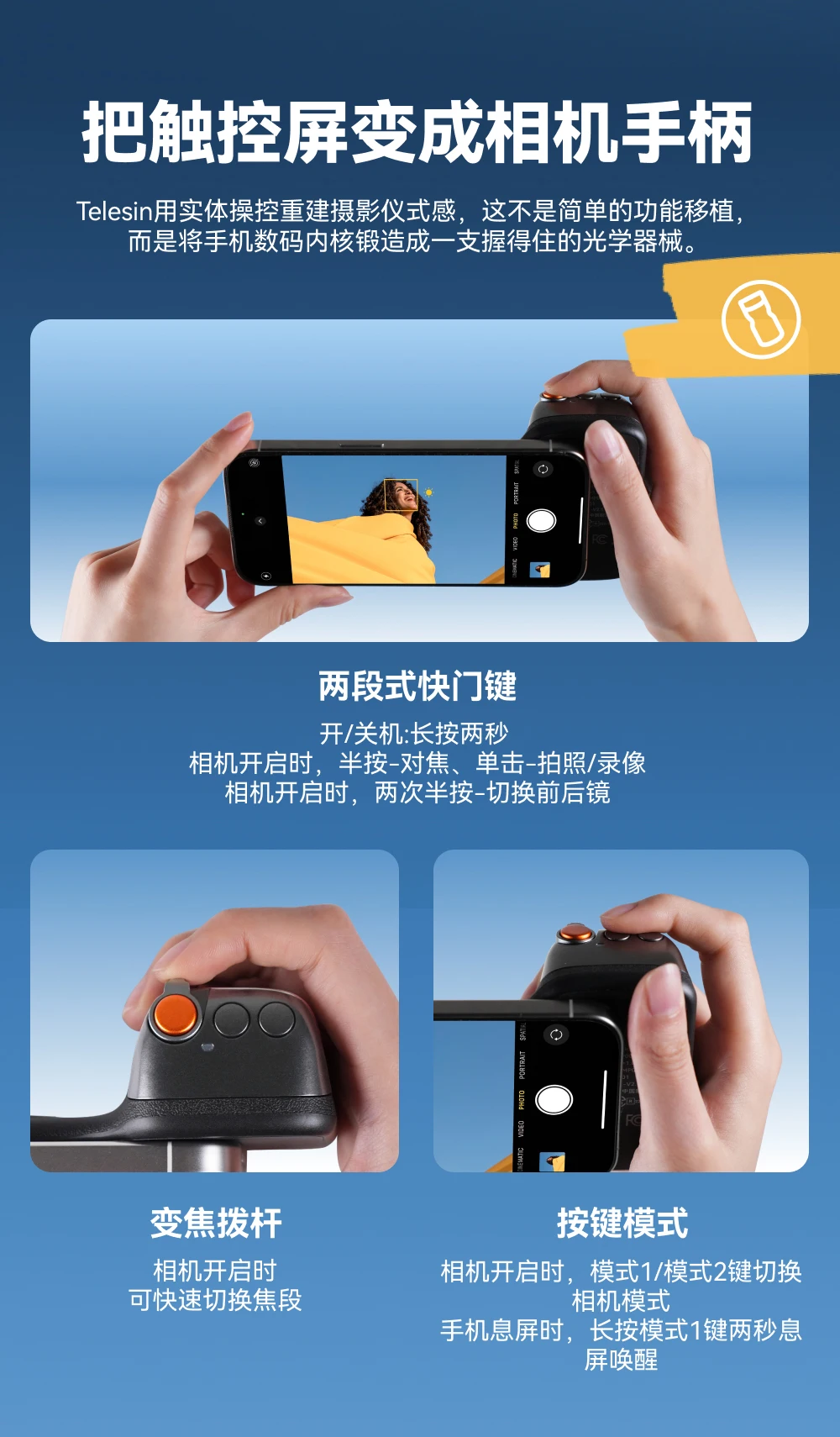 Obturador físico de dos etapas: presione hasta la mitad para enfocar/clic único para tomar fotos/clic doble para cambiar de lente;