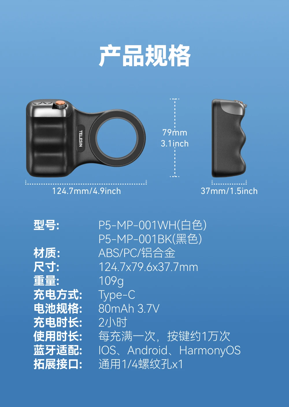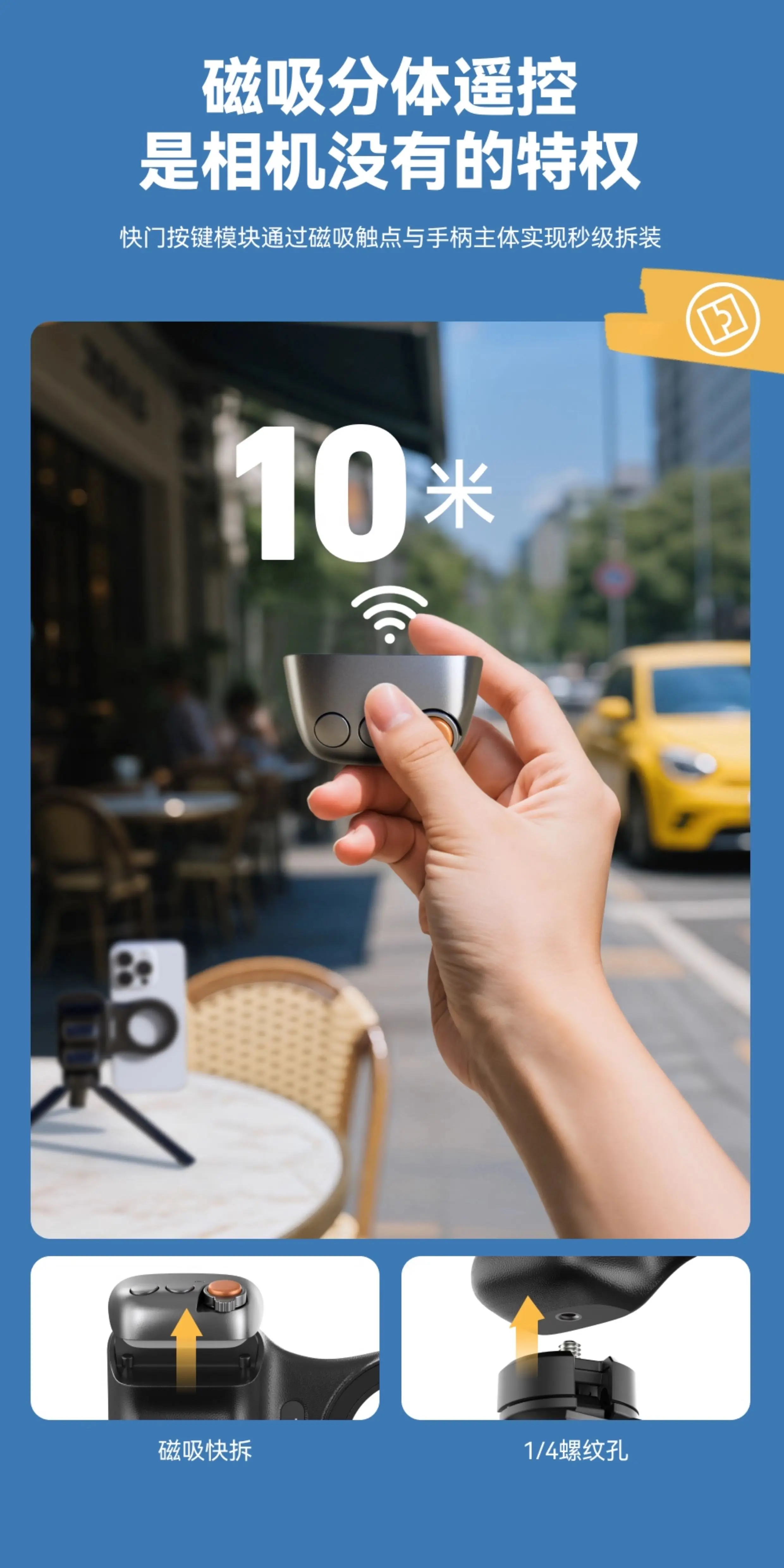 El mango y el control remoto están separados magnéticamente, con un control remoto inalámbrico de 10 metros, lo que permite selfies/fotos de grupo/fotos de ángulo bajo a voluntad.