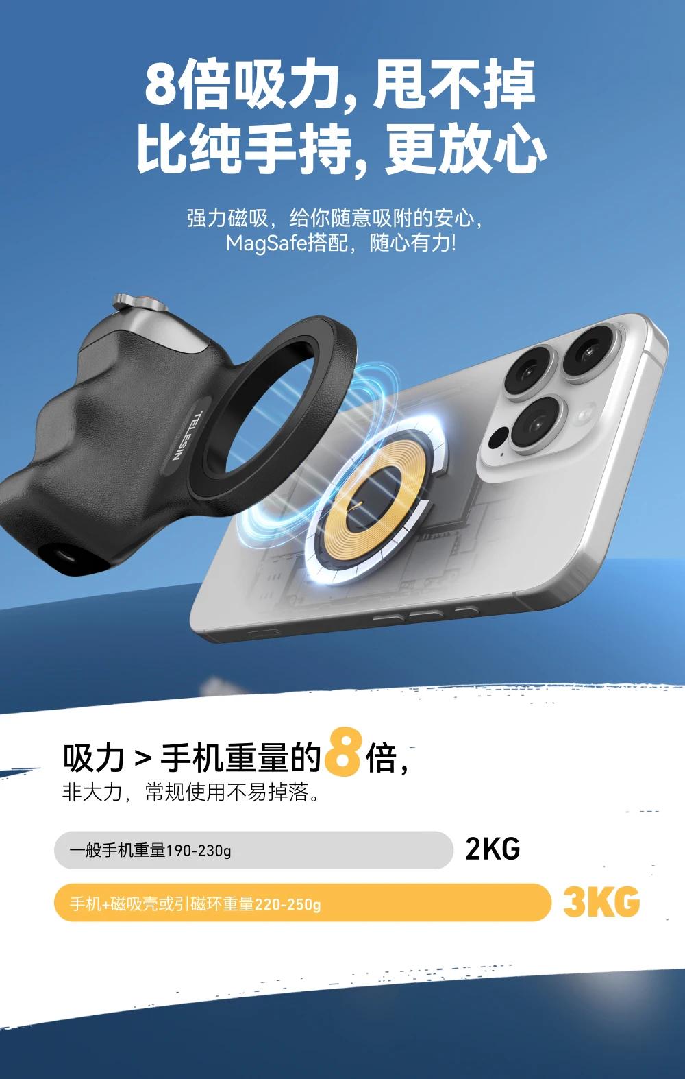 8 x fuerza de succión magnética (2-3 kg), 10 veces el peso del teléfono, redundante y incapaz de sacudir;