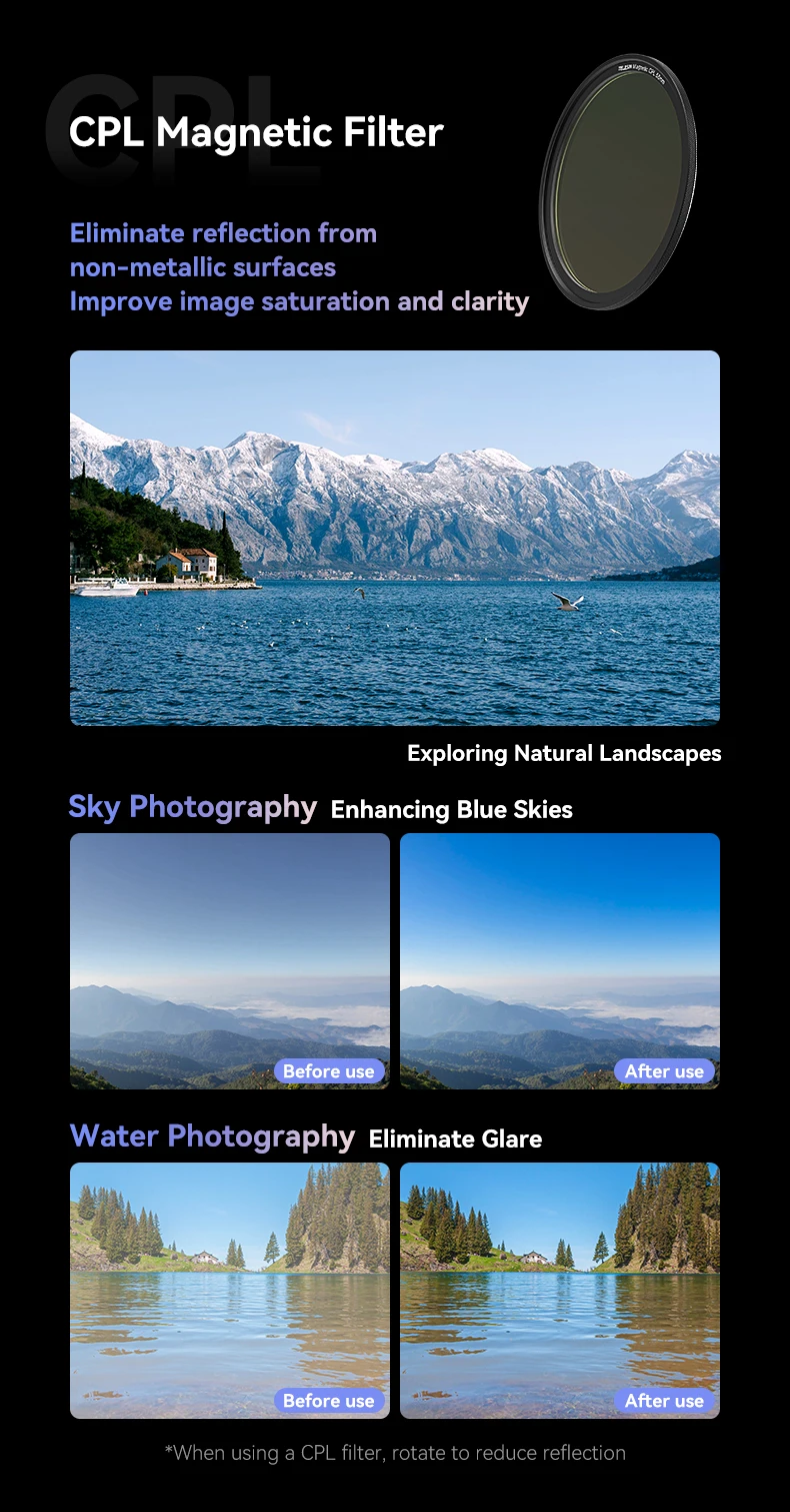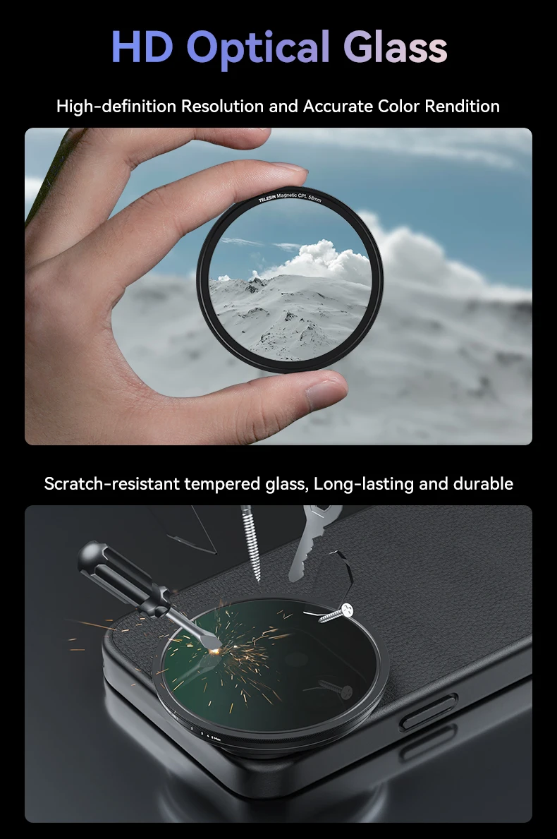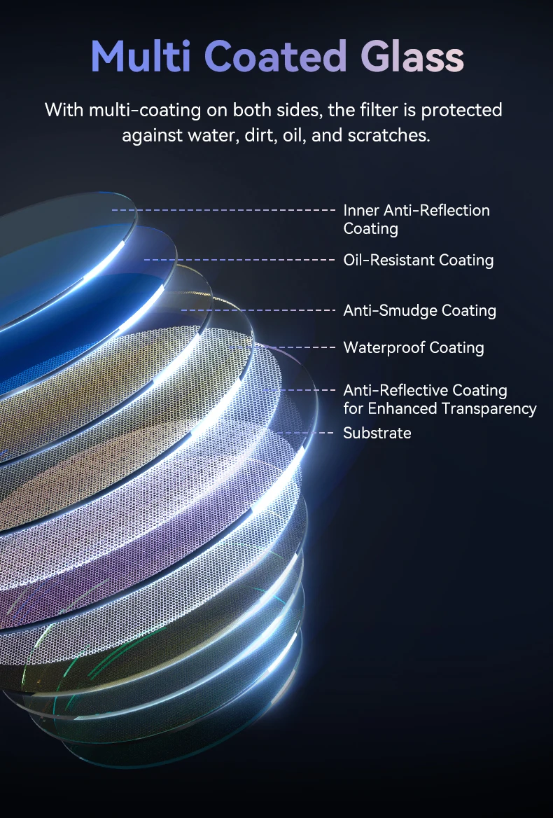 Con revestimiento múltiple en ambos lados, el filtro está protegido contra el agua, la suciedad, el aceite y los arañazos.