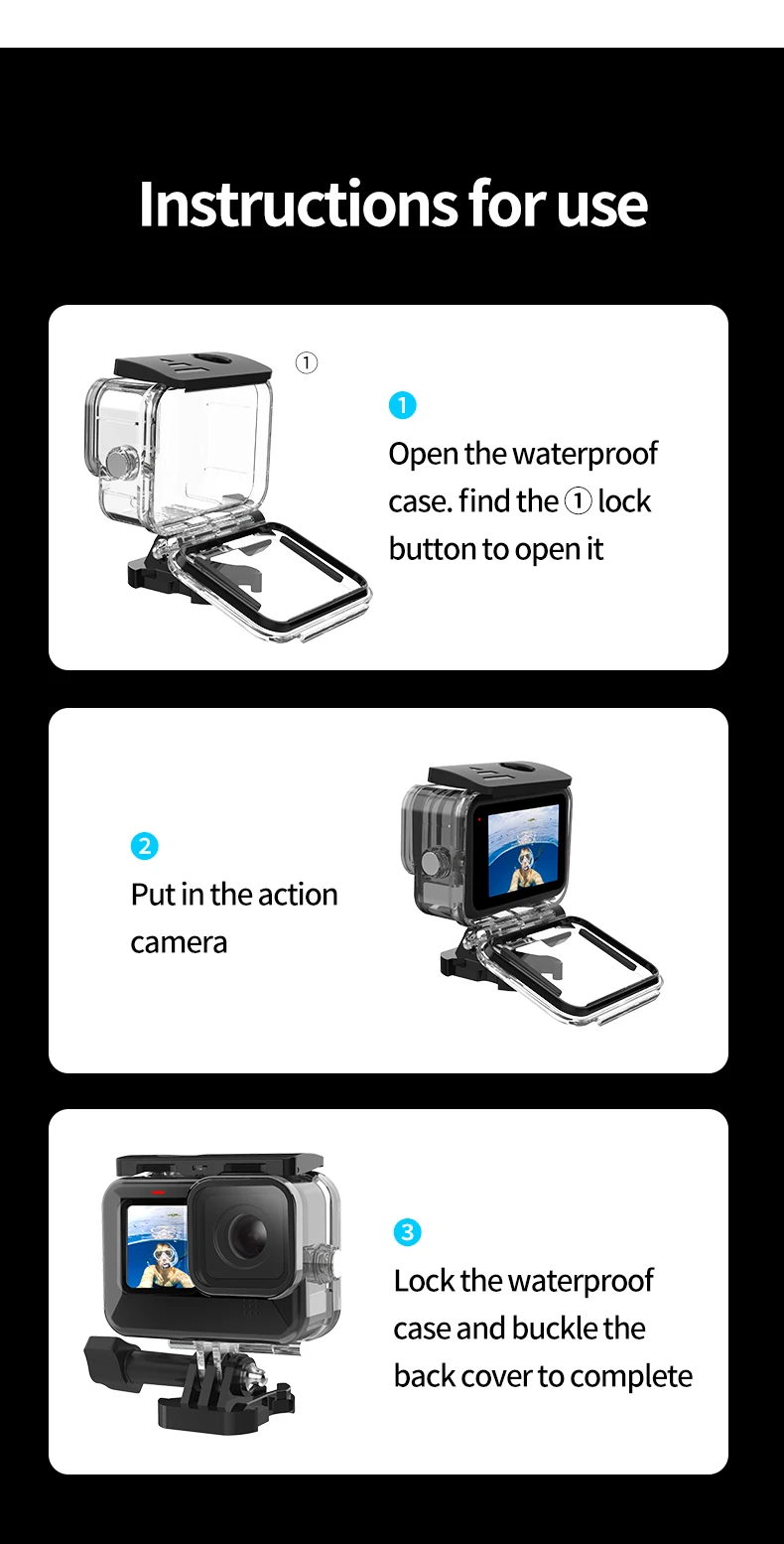 2. Con esta carcasa impermeable perfectamente puedes usar la cámara a 60m bajo el agua; la presión anti-surf de la carcasa impermeable no afectará tu movimiento y efecto fotográfico;