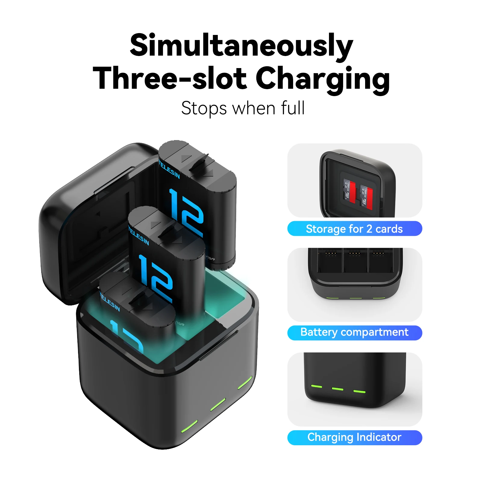 TELESIN para GoPro 9 10 11 12 batería 1750 mAh 3 vías caja de carga de luz LED tarjeta TF almacenamiento de batería para GoPro Hero 9 10 11 12 accesorios negros