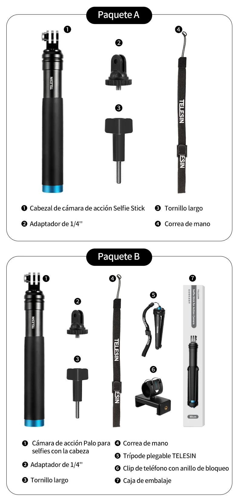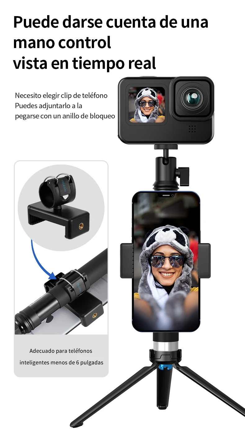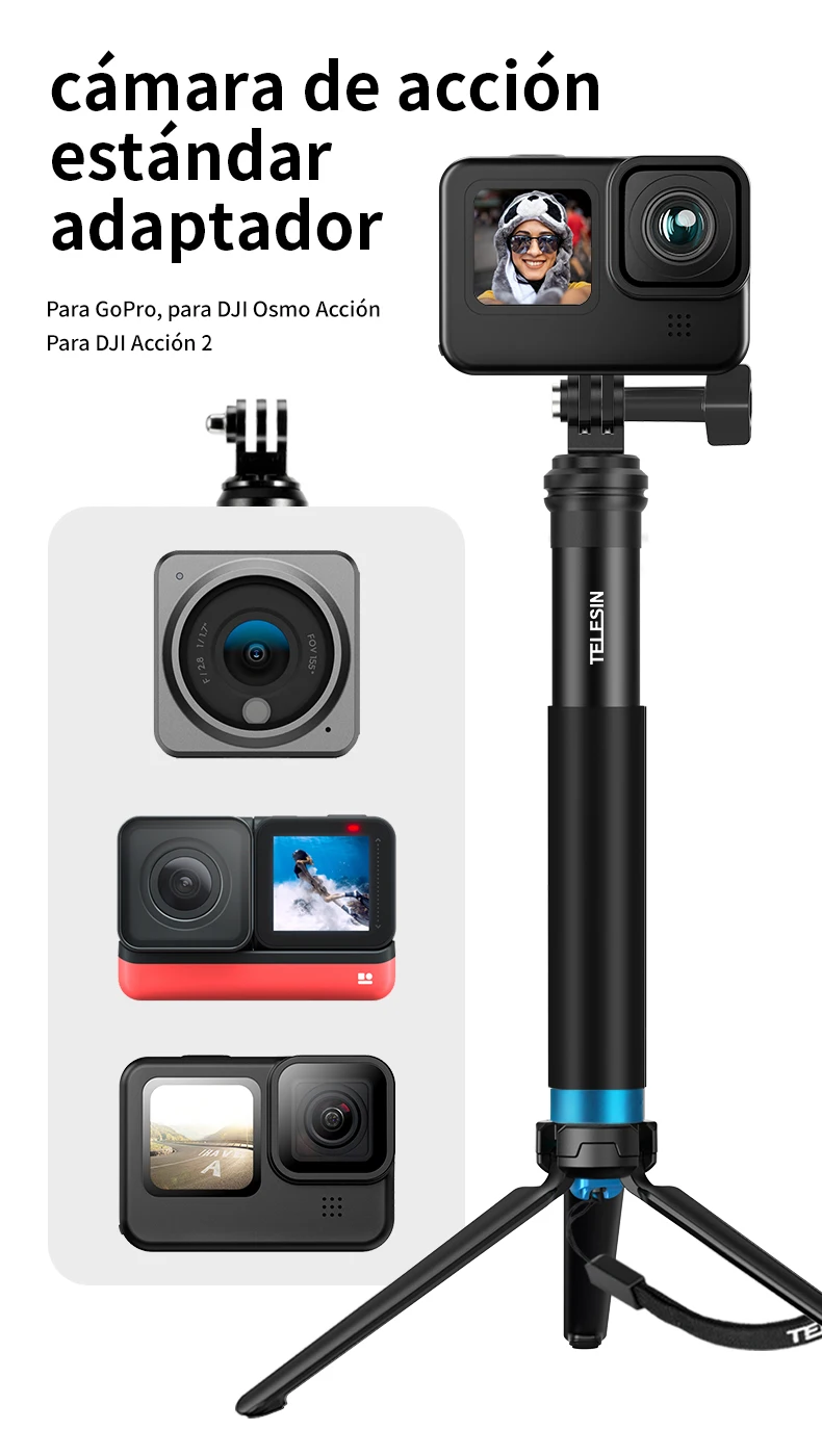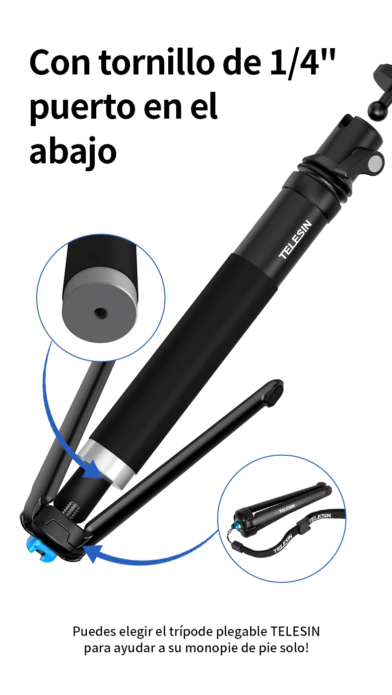 5. Con 1/4 de tornillo de puerto "en la parte inferior, ¡puede elegir el trípode plegable TELESIN para ayudar a su monopié a estar solo!