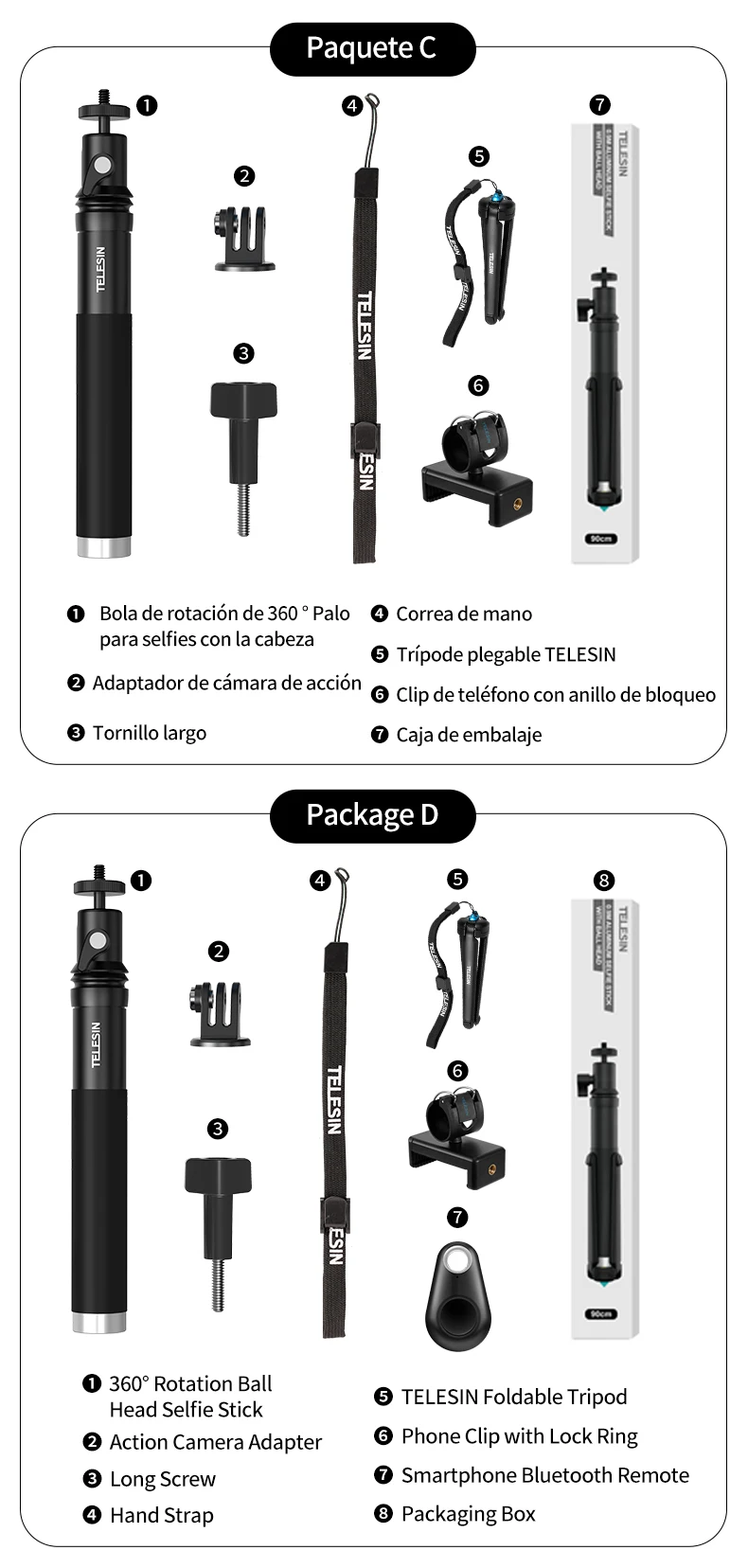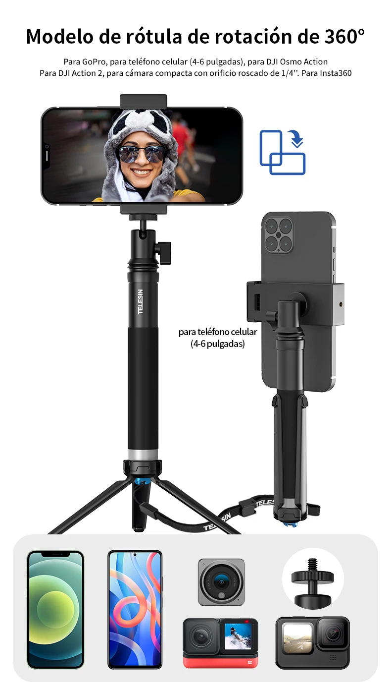 TELESIN-Palo de Selfie para GoPro, trípode plegable con rotación de 360 ° y soporte de teléfono, monopié de aleación de aluminio para teléfono inteligente DJI Insta360
