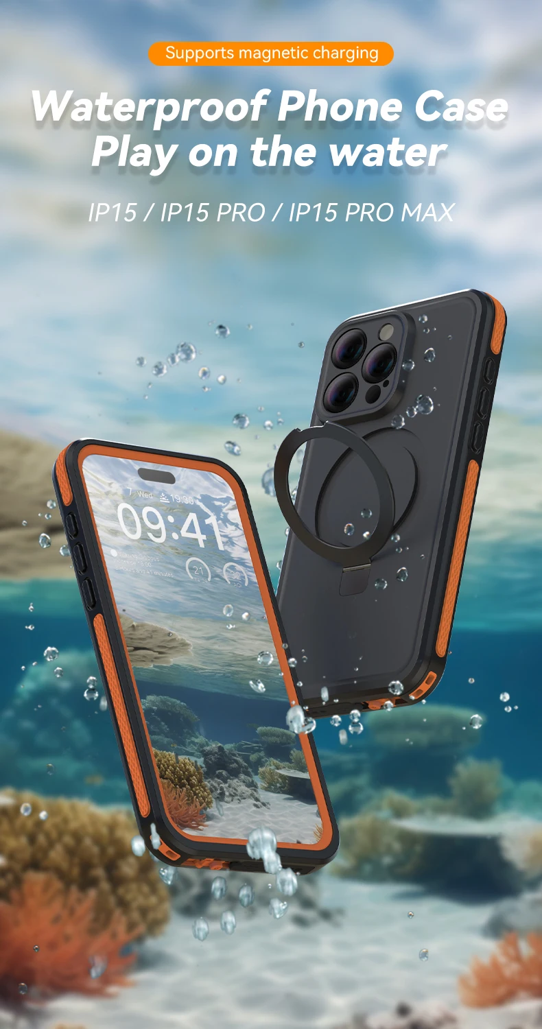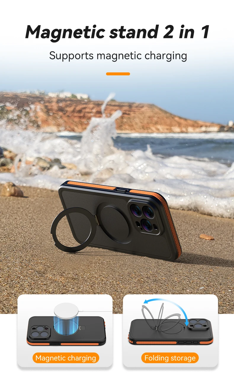【Soporte para teléfono y carga 2 en 1】El anillo magnético en la parte posterior de esta funda impermeable para iPhone 15 Pro Max no solo es compatible con Magsafe para carga inalámbrica, sino que también se puede usar como soporte para teléfono celular de escritorio, verdaderamente un producto para múltiples propósitos: admite conexión magnética, carga y soporte.