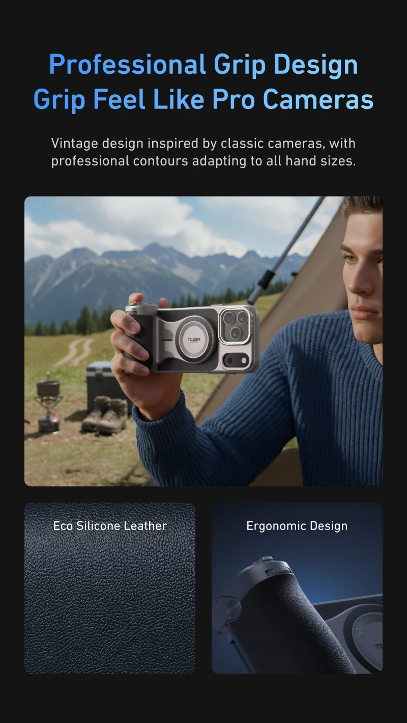 Mejore su fotografía móvil con TELESIN Master Grip, diseñado específicamente para iPhone 17 Pro y Pro Max.Este mango de mano profesional combina un diseño clásico con funcionalidad avanzada para brindar comodidad y control superiores al disparo.