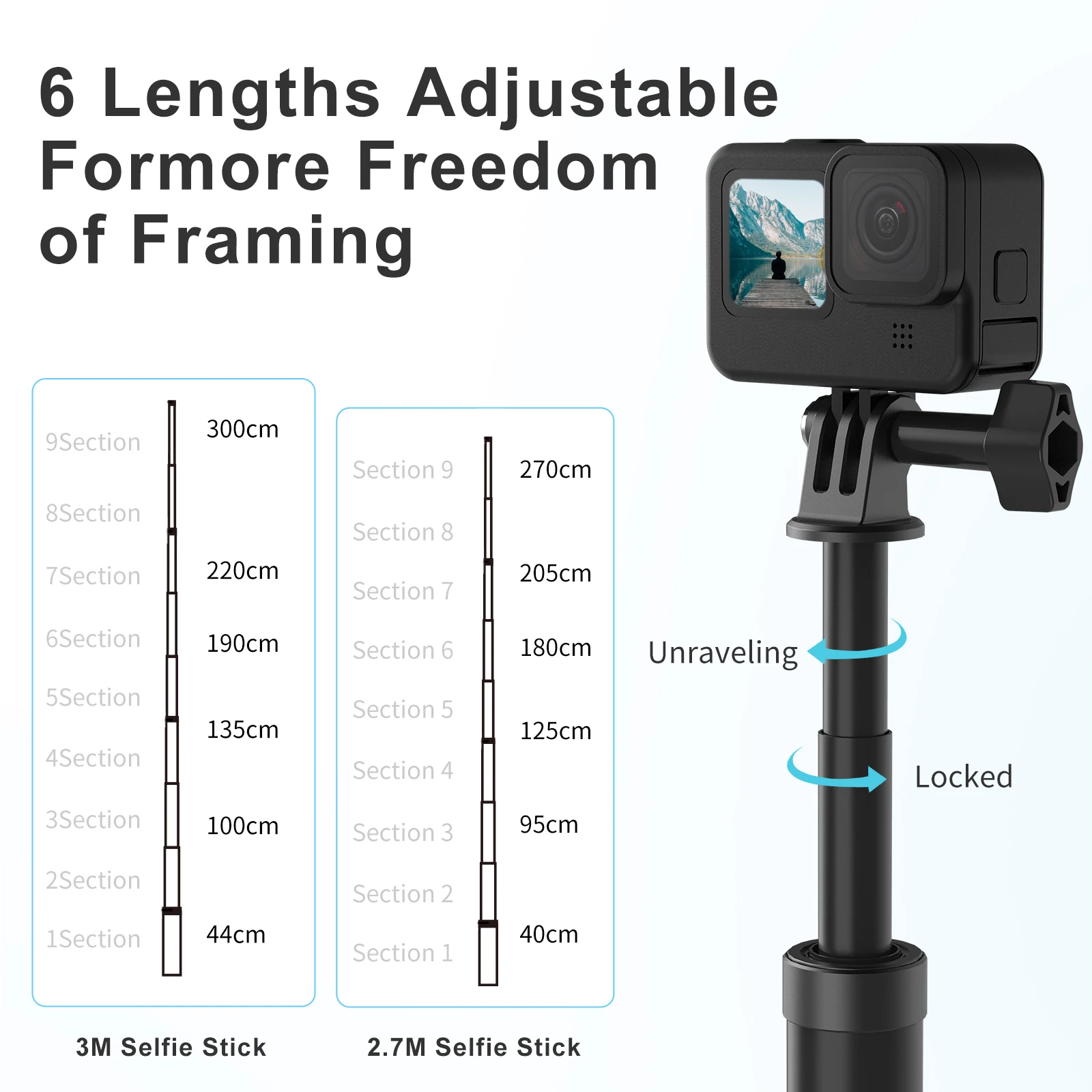 TELESIN 118 ''/3M Ultra largo monopié de fibra de carbono Selfie Stick para GoPro Hero 12 11 10 9 8 7 6 5 4 Max Insta360 One X One R Osmo Action